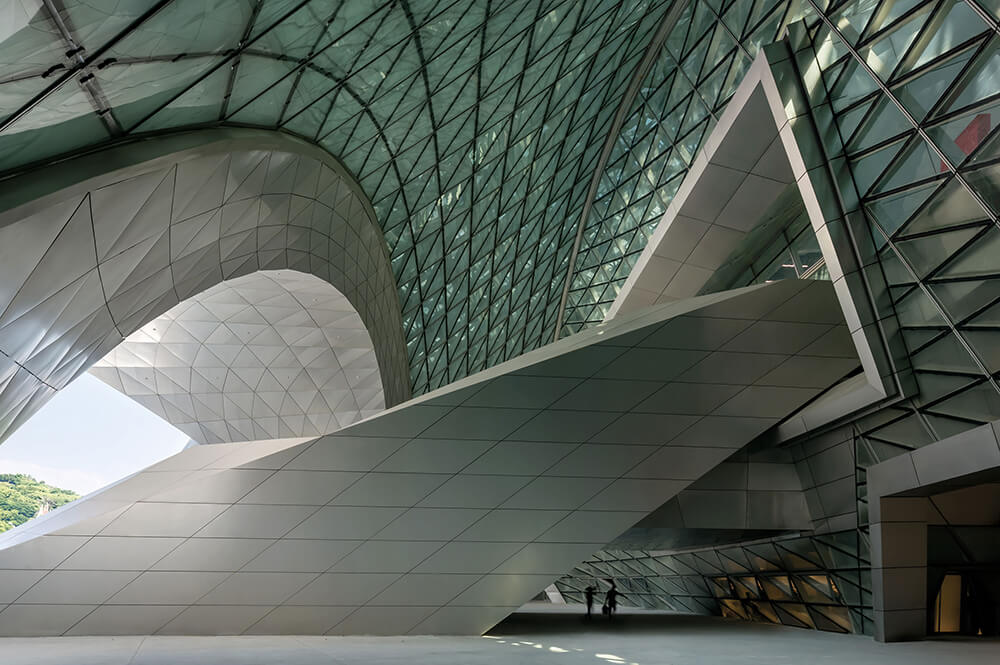 The MOCAPE monolith completes the eastern part of the master plan for the city center and fills the last gap in the Futian Cultural District, between the Youth Activity Hall (YAH) to the north and the opera-library complex to the south. Similar to other buildings in this district, the main level of the MOCAPE lies 10 meters above the ground level and so creates a stage-like platform acting as a unifying element with the adjacent buildings. The monolithic skin of the MOCAPE performs as a “dynamic” surface that was designed to respond to the urban context by twisting itself towards the center of the Futian Cultural District. This rotation also impacted the orientation of the entrance as well as the main circulatory flows, directing them towards the center of the district. In terms of construction, the exterior skin, which is structurally independent from the mounting framework of the museum buildings, consists of an outer layer of perforated metal panels and a climate envelope made from insulated glass. The technical building equipment is designed to reduce the overall need of external energy sources: Pollution free systems and facilities use renewable energy sources through solar and geothermal energy, and only systems with high energy efficiency have been implemented.