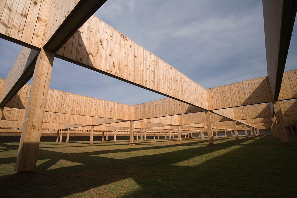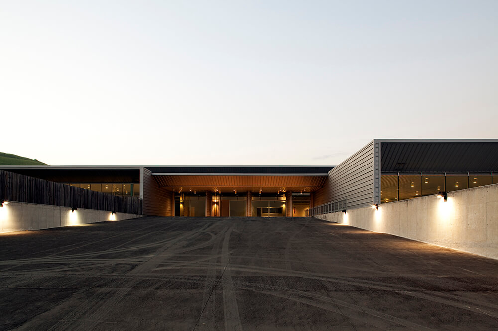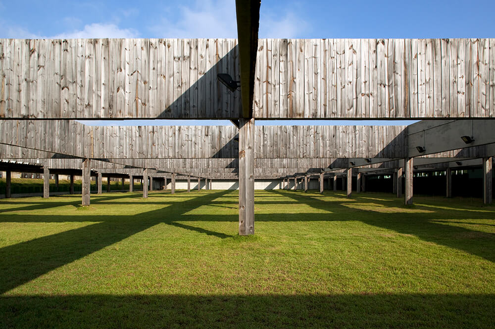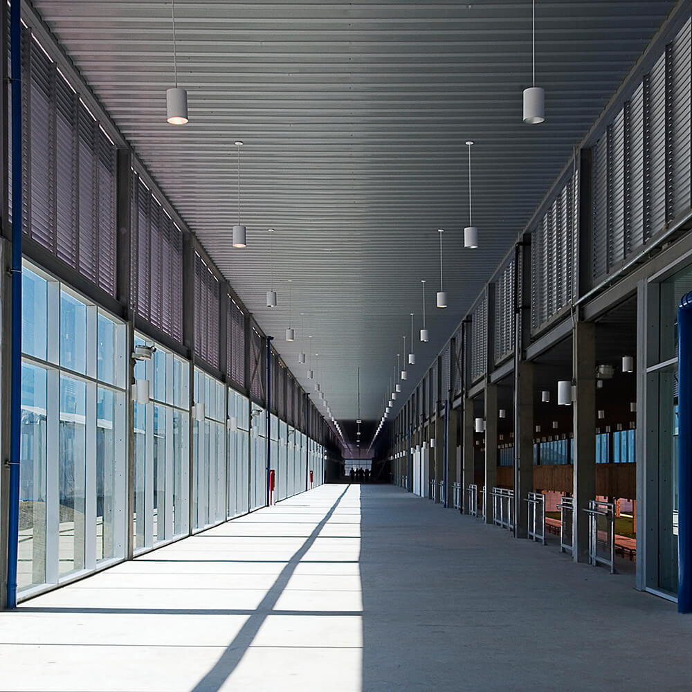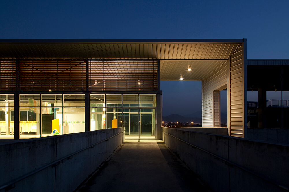 The Shooting Center has approximately 30.000m² of built area, landscaped on a 125.000m² site along one of the most important access vectors of the city (a hybrid of avenue and motorway). Strong horizontal lines predominate in this concrete sports complex located on a roughly trapezoidal plot in a breathtaking valley surrounded by mountain peaks. The complex has indoor and outdoor facilities such as training halls and grandstands, and features parking and service areas. The nighttime periodical pattern of lighting along the peripheral wall and on the right-angled overhead structures produces an otherworldly effect of floating in the dark valley against the backdrop of a slowly setting sun.