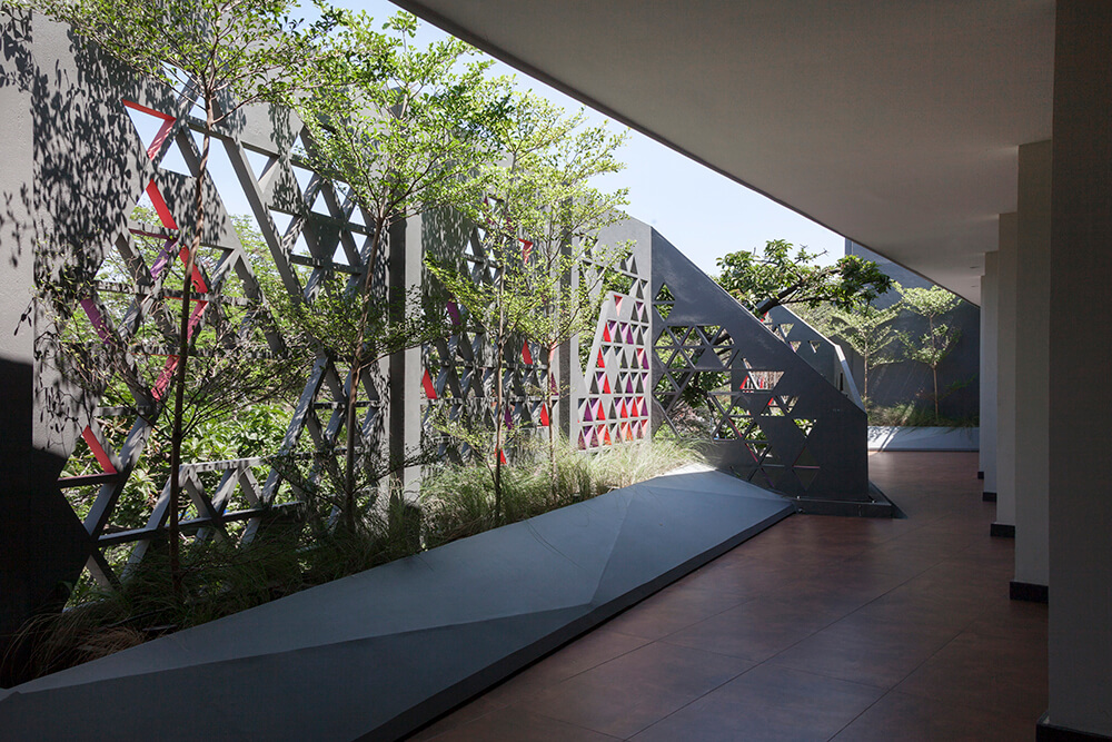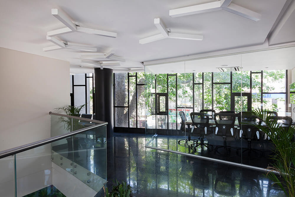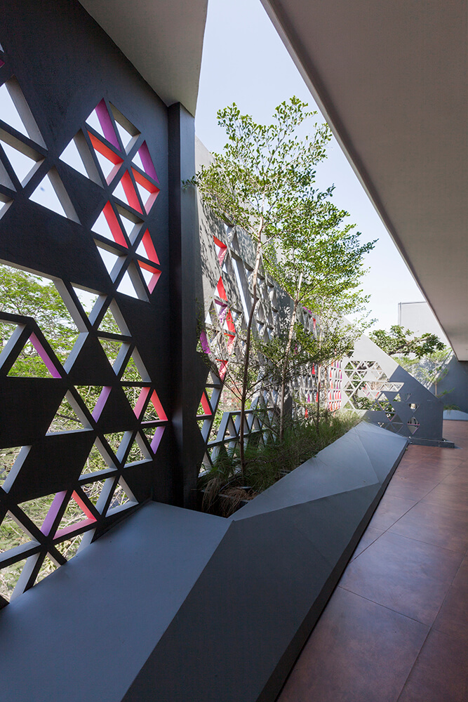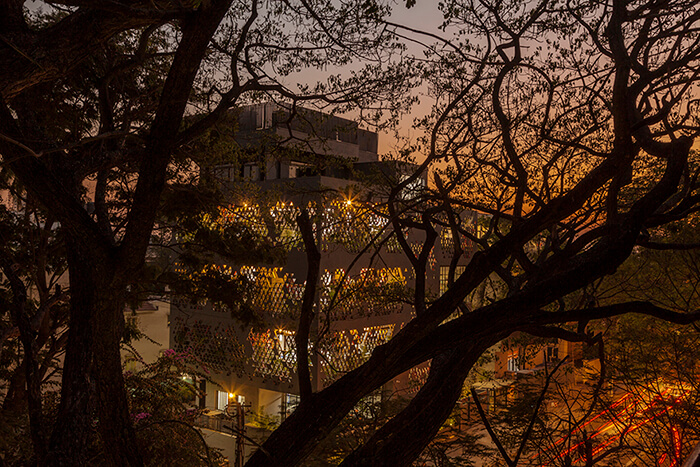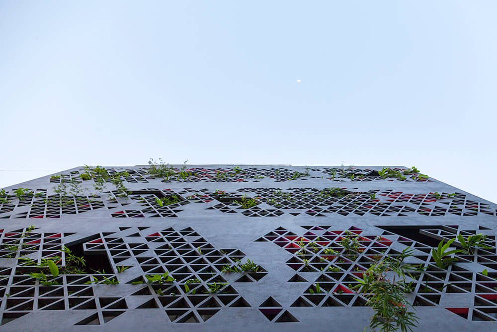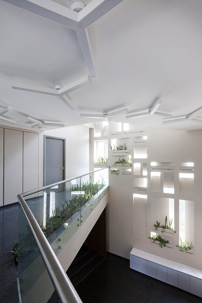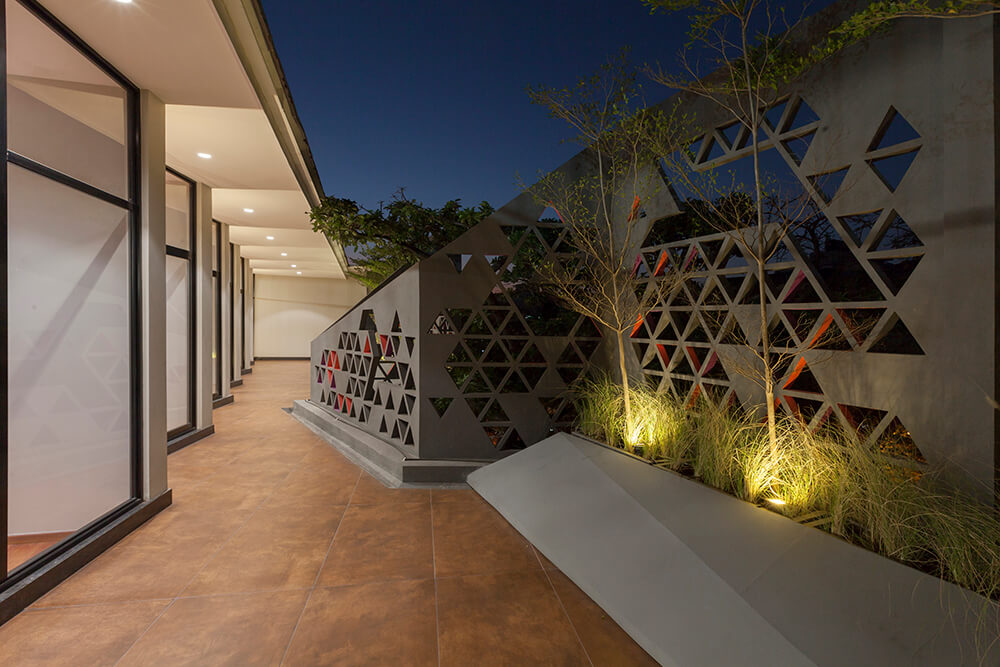 The idea of the jali with green was twofold. The jali screen would enable us to cut down the harsh sound from the street traffic and the general humdrum of the city. It would also cut the harsh light that would infiltrate the interiors. The traditional Jali was re-imagined in a contemporary pattern to form a light ephemeral veil for the interiors. We infused life into this jali buy juxtaposing it with a layer of curated medicinal plants. The plants protected by the jali not only help in therapeutic purposes but also help create a soft ambience in the interior. The jali was constructed out of ferro-concrete to enable the complex pattern desired.