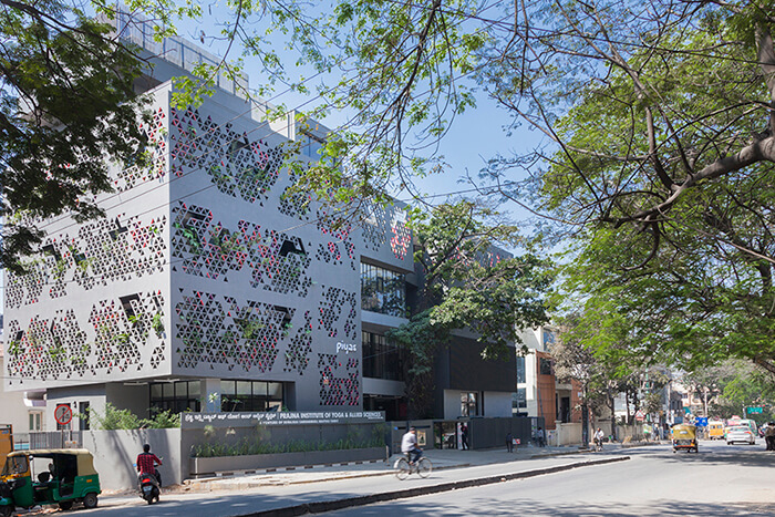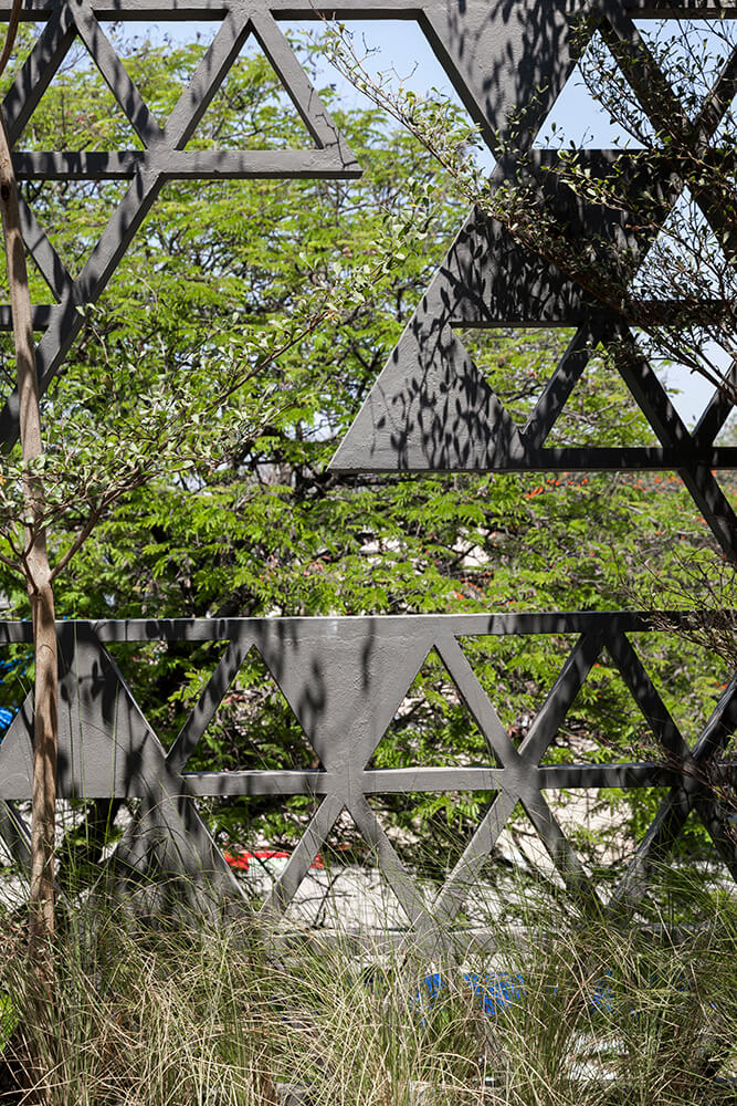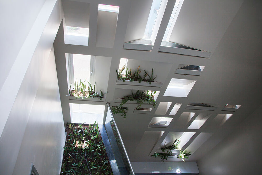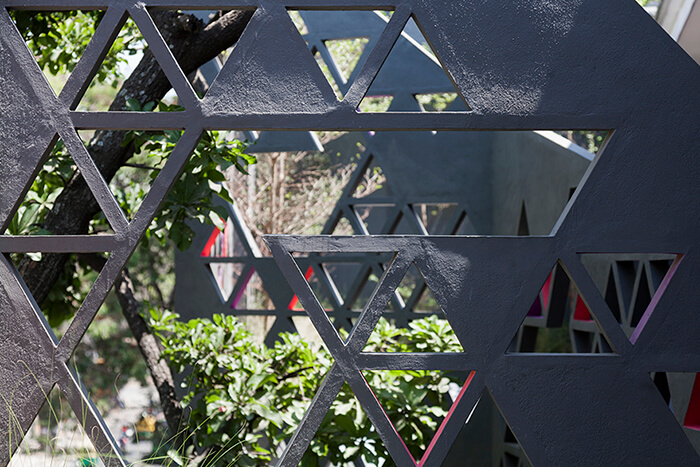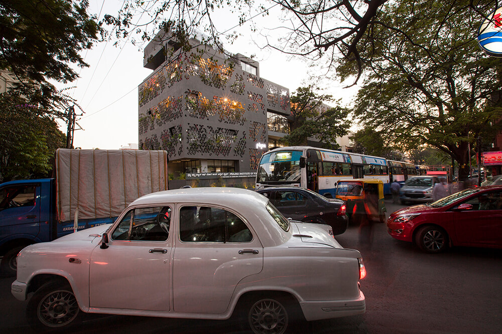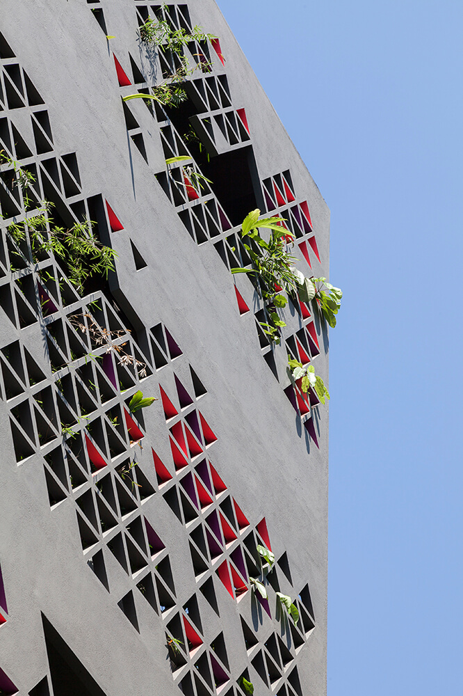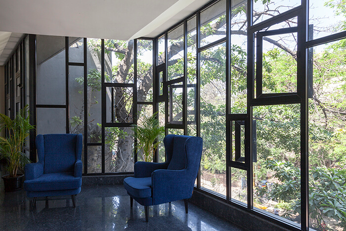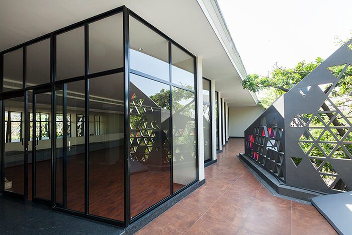 The idea of the jali with green was twofold. The jali screen would enable us to cut down the harsh sound from the street traffic and the general humdrum of the city. It would also cut the harsh light that would infiltrate the interiors. The traditional Jali was re-imagined in a contemporary pattern to form a light ephemeral veil for the interiors. We infused life into this jali buy juxtaposing it with a layer of curated medicinal plants. The plants protected by the jali not only help in therapeutic purposes but also help create a soft ambience in the interior. The jali was constructed out of ferro-concrete to enable the complex pattern desired.