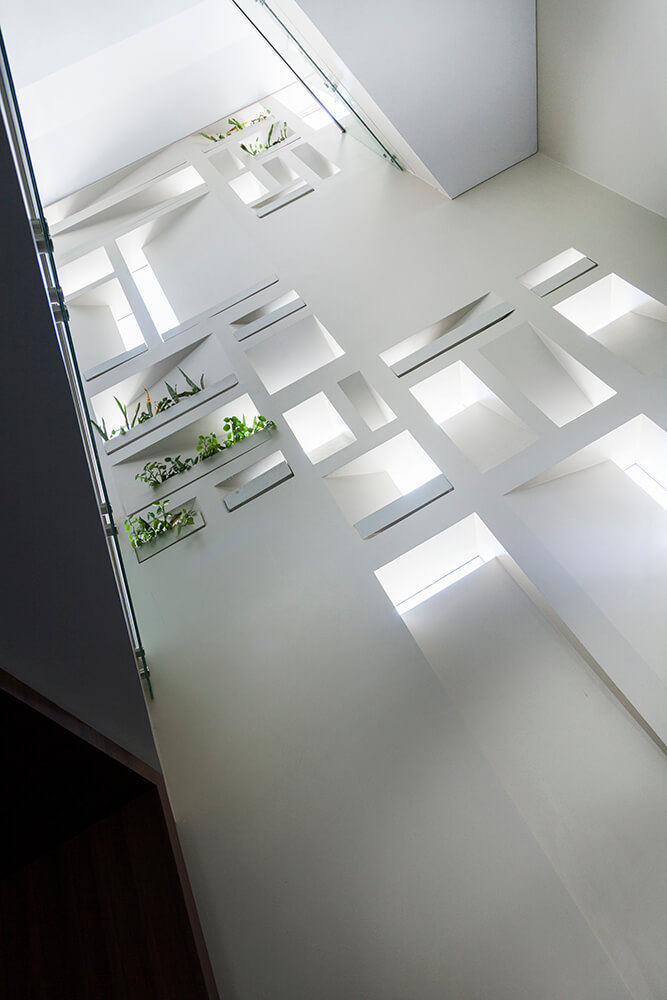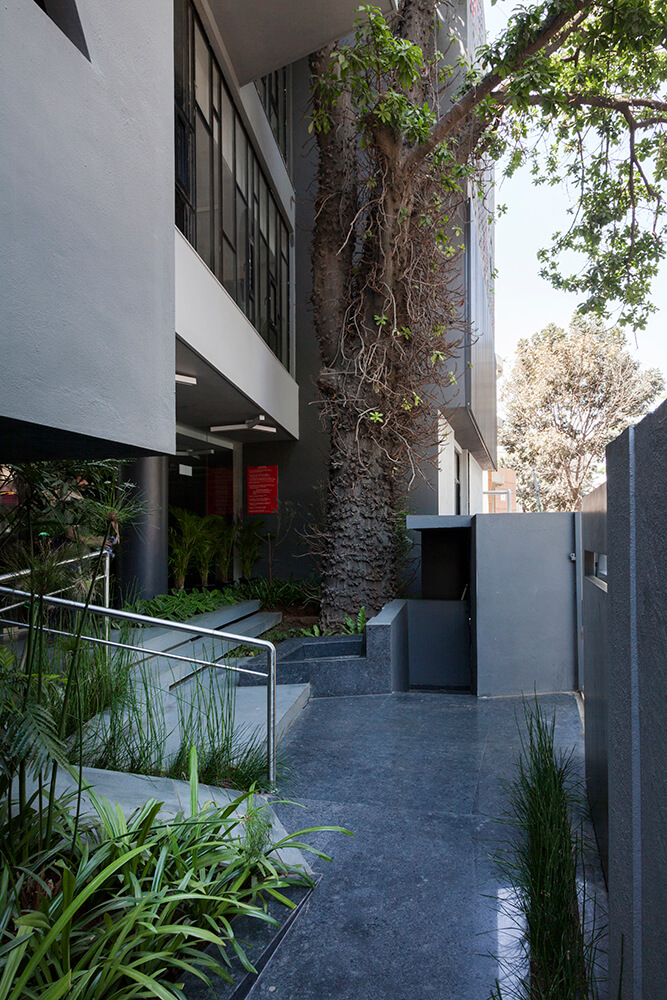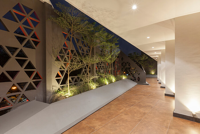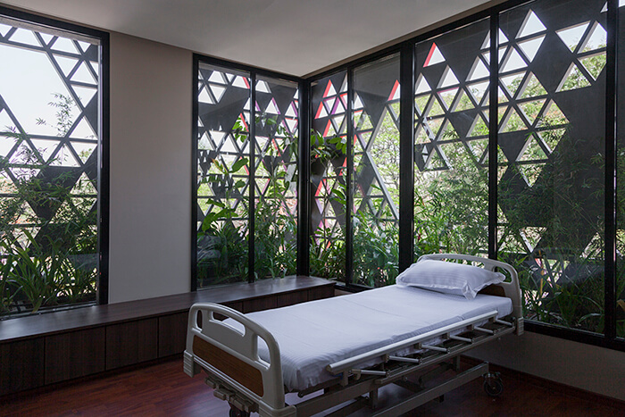 The ground floor has the reception along with waiting area for the patients. The consultation rooms, labs and pharmacy work around the waiting area. We also included an organic restaurant along with a kitchen at this level which encourages general well being. The floors on top are comprised of therapy rooms with various treatments along with rooms and suites for in-patients. These spaces open up to the strip of green screened by the jali. An atrium cuts through the building to connect the various floors both visually and spatially. The Yoga hall was positioned on the terrace along with the garden as spillover area.