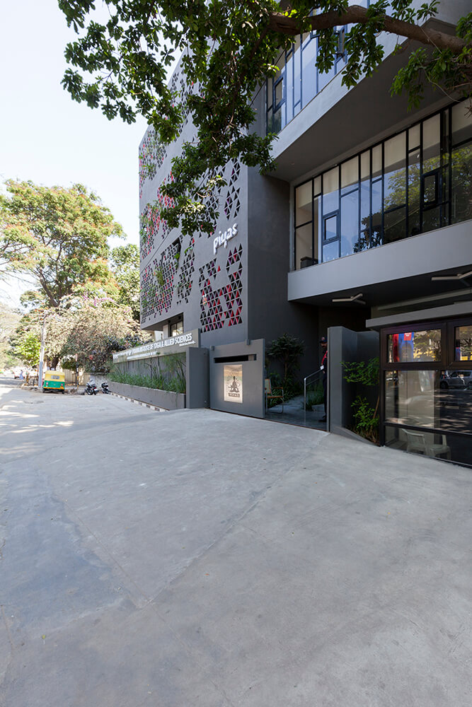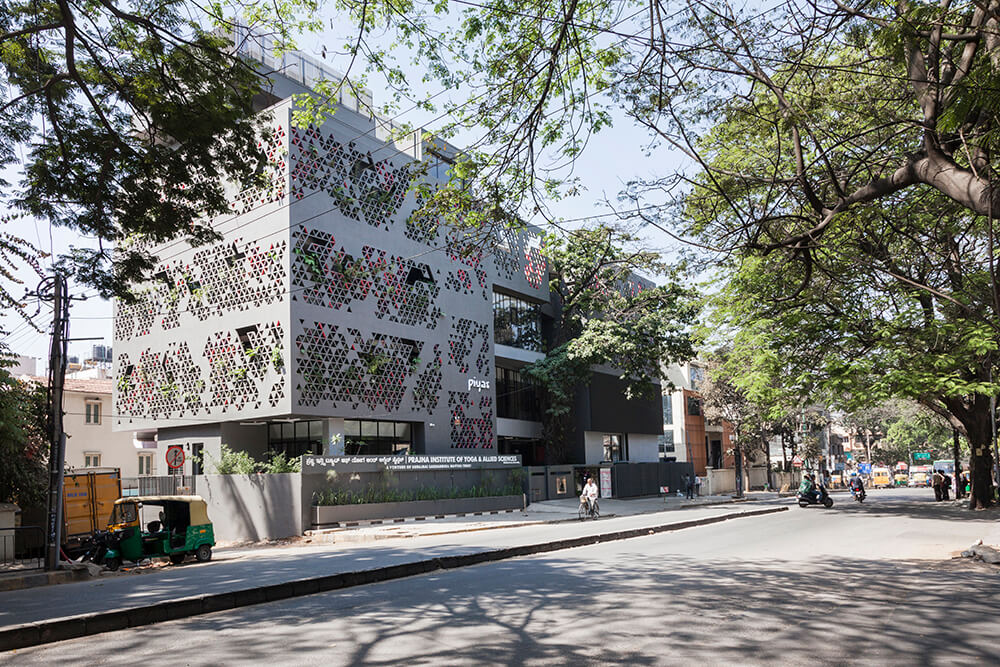 The client brief was to design a naturopathy center with a yoga hall in a tight urban site. The fact that the center was meant for therapy and wellness but had to be designed in a busy, noisy, polluted node in the city was the challenge. What struck us most when we visited the location was the presence of a huge Canon Ball tree (a sacred tree by many accounts), which defined the character of the site. The site was also flanked by a very busy road which forms an important artery in the city’s road network. These two characteristics helped us formulate the generative diagram for the conception of the project. We decided to conceive the plan such that the building weaves around the existing tree not just physically but also phenomenally in a way that it becomes part of the experience. The second important stand taken was to wrap most of the building with a thick layer of green along with a modern interpretation of traditional jail screen. The yoga hall was then conceived to be on the terrace with a column free space away from the noise of the streets.