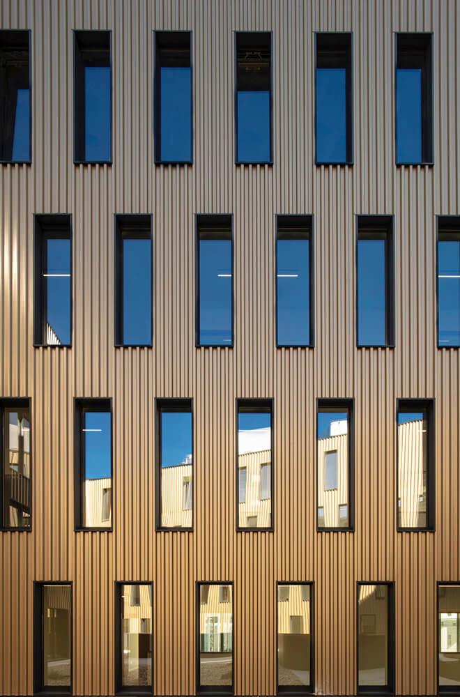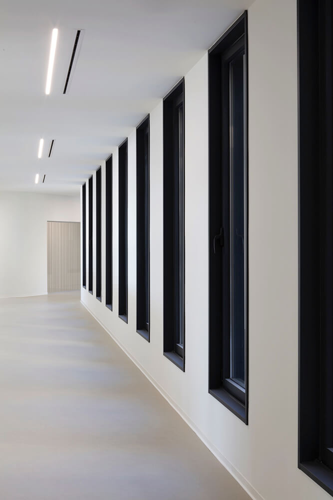 In this kind of buildings, there is an important need of keeping privacy and discretion, so this causes an introverted building, opened to the interior central space but, at the same time, with the force of permeability: this is obtained by a double skin, made by an interior coat totally glazed, and an exterior one with vertical slats serving as solar protection and views.