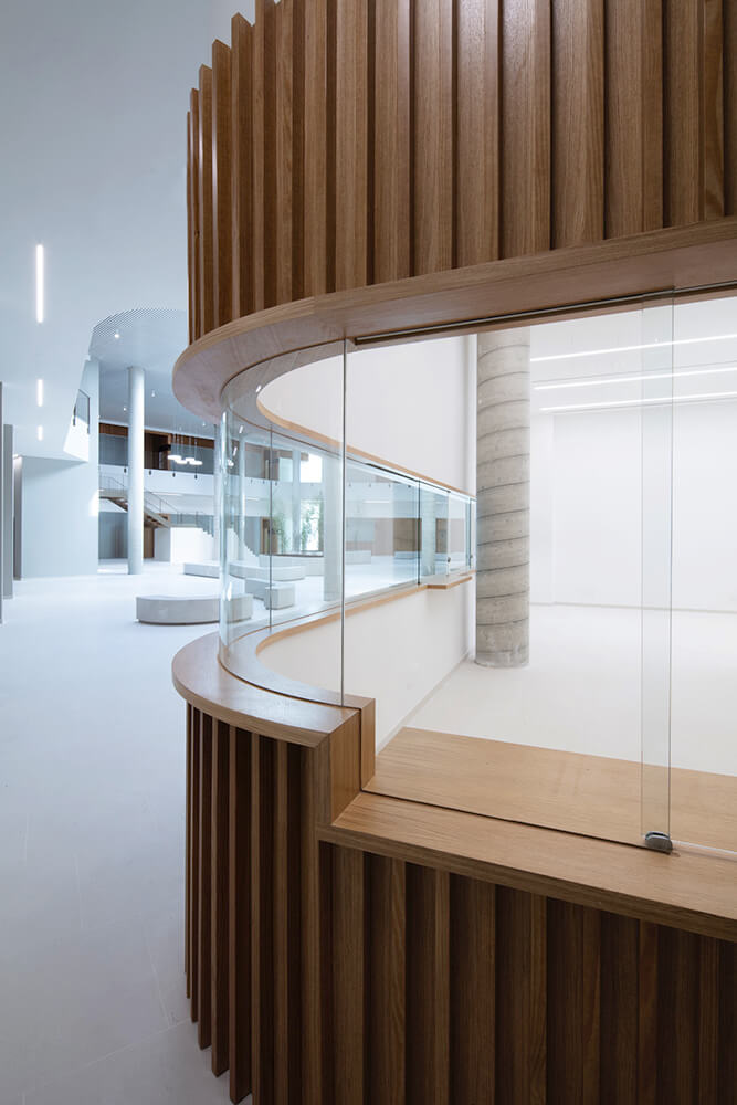 The materials chosen in this space contribute to the acoustic insulation and maintain a calm atmosphere despite being the most public space in the entire building.
