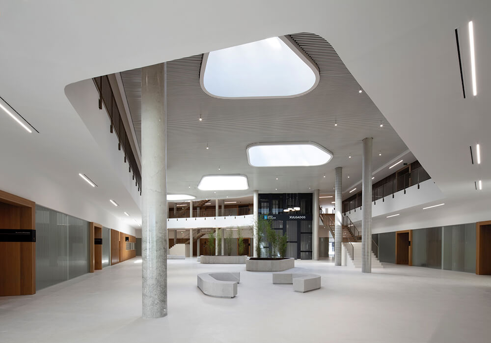The ground and first floors, organized around its atrium in double height, are intended for 16 viewing rooms and other services that need more direct public access. The ground floor houses 8 courtrooms, with their rooms for witnesses and/or experts. The largest of them (wedding hall), have direct access from another entrance.