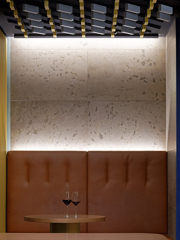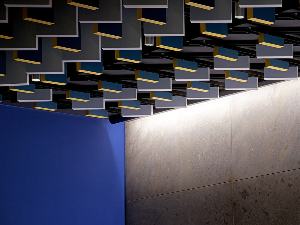 Thanks to a clever interior design, the café/bar with its informal atmosphere offers the perfect setting for all tastes at any time of the day or night. Different seating situations are grouped around a central counter, forming separate zones thanks to the special design of floor and ceiling. A small, elevated niche, from which one can overlook the entire space, offers a new favourite spot for people-watchers. For us, it was key to create a “room within a room”, so that the overall fluid effect is not impaired by partitions.