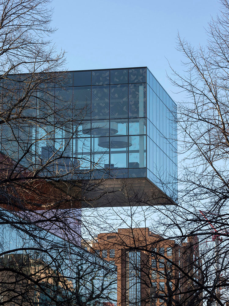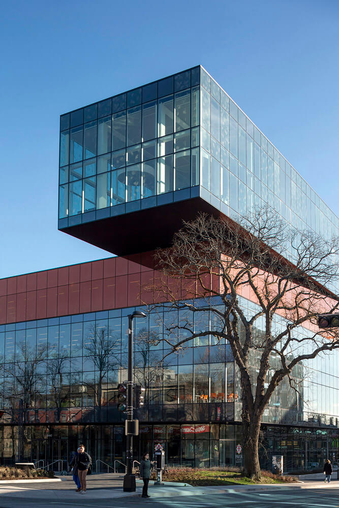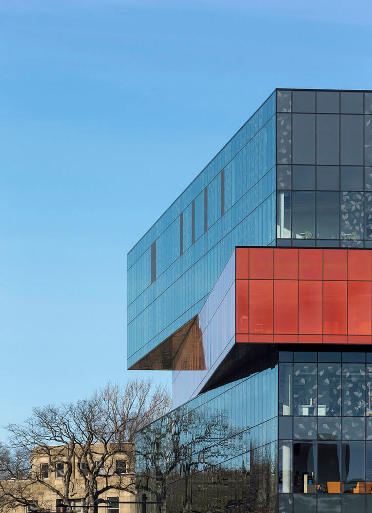 The exterior of the library appears as four rectangular shapes placed on top of one another and horizontally twisted to relate to the two diagonal directions that are dominant in the otherwise orthogonal grid of the city.