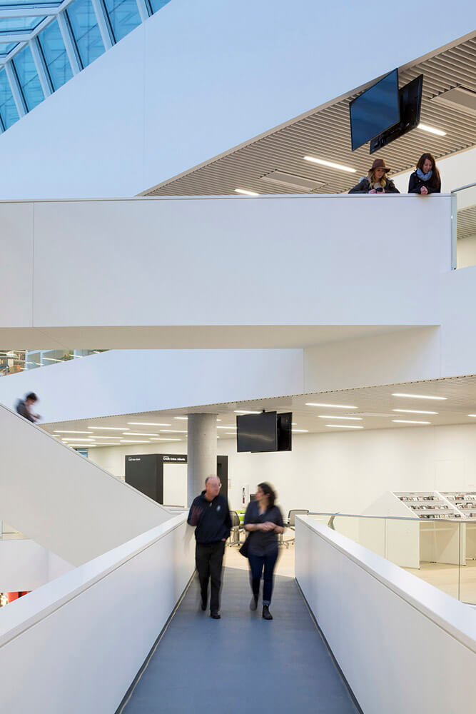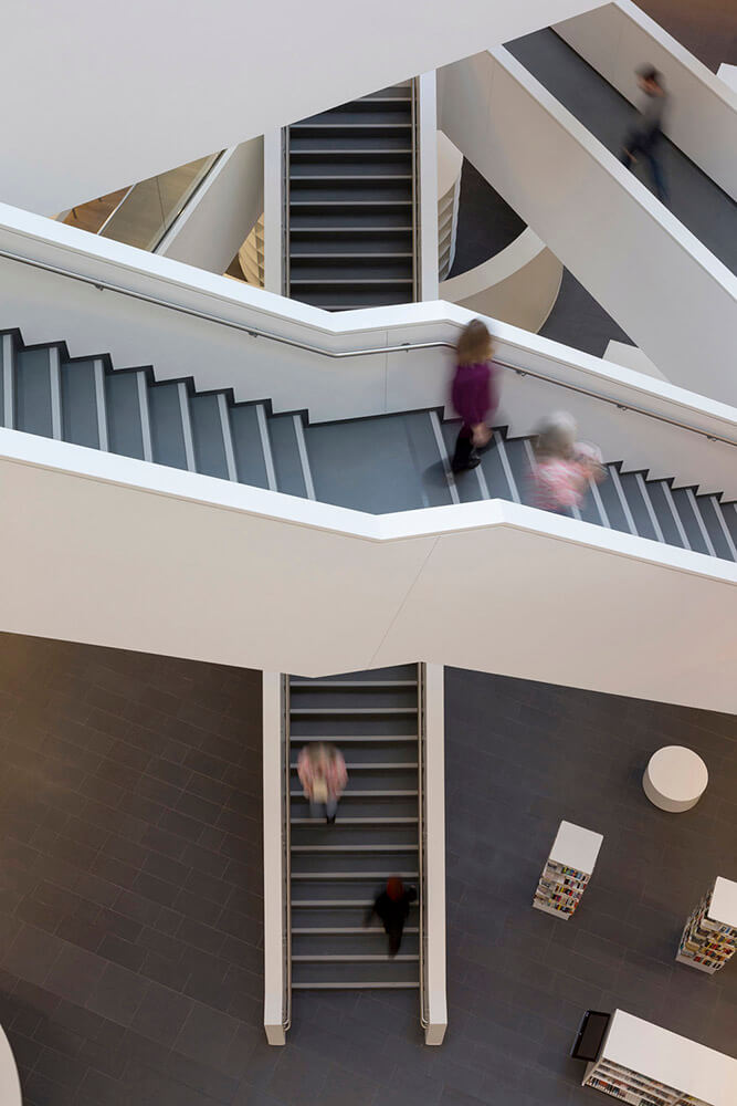 The interior of the library reflects the diversity of the exterior with stairs and bridges in the atrium connecting the five storeys. The light-filled atrium gives an overview of the wide range of facilities the library offers, including a 300-seat performance space, two cafés, gaming stations, music studios, dedicated space for adult literacy classes, a First Nations reading circle, and boardrooms for local entrepreneurs. The entire second floor is dedicated to children and young adults with areas designed for each age group, ranging from toddlers to teens.