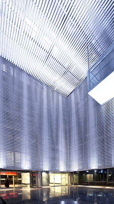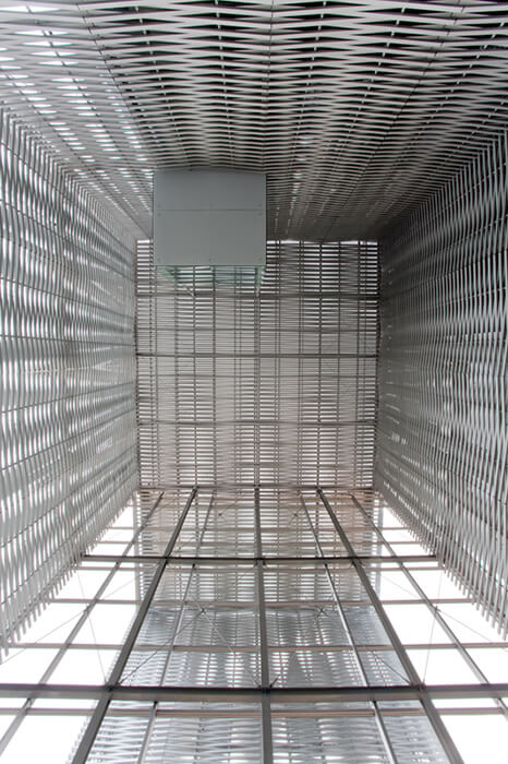 The first, a metallic tissue-like envelope surrounding all sides of the cube, especially designed to give a pleasant and welcoming impression inside and outside the site. This is achieved by playing with natural light during the day and creating a different effect with artificial light at night.