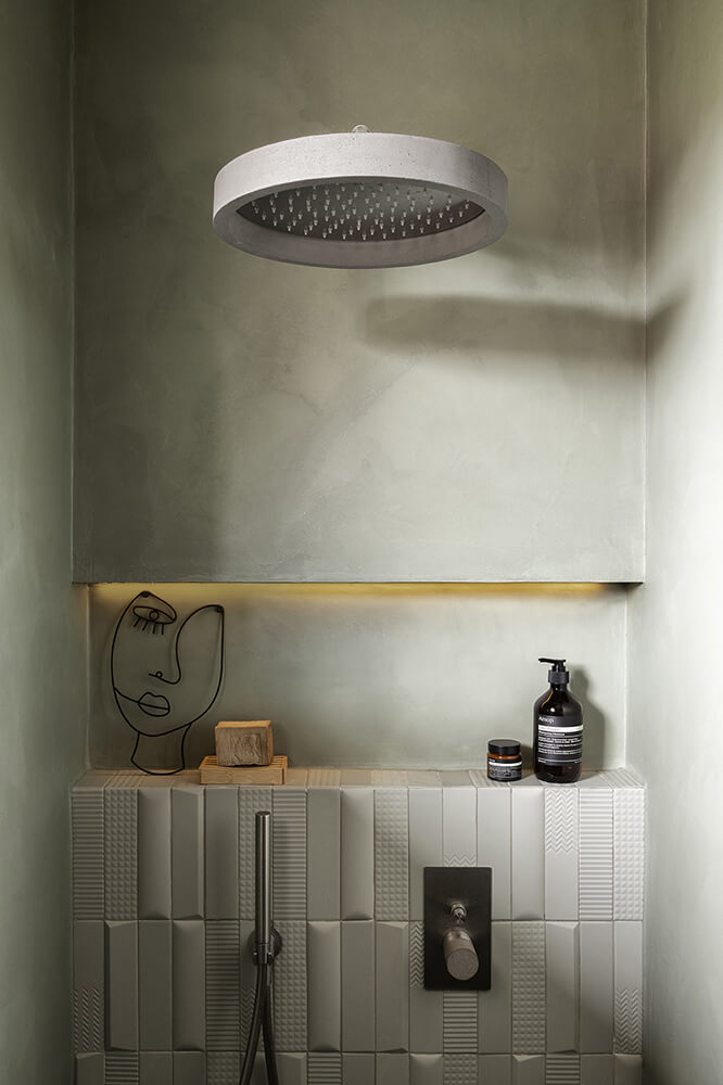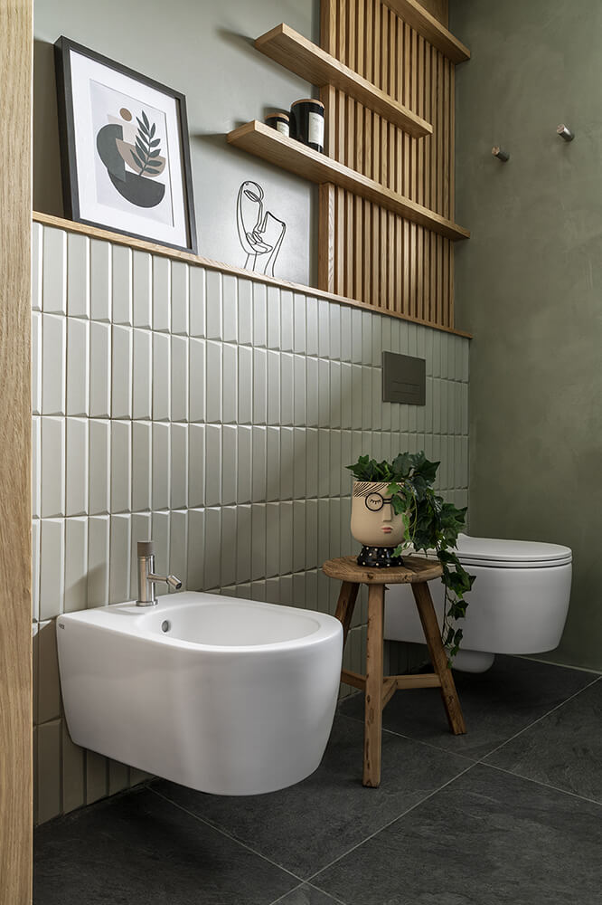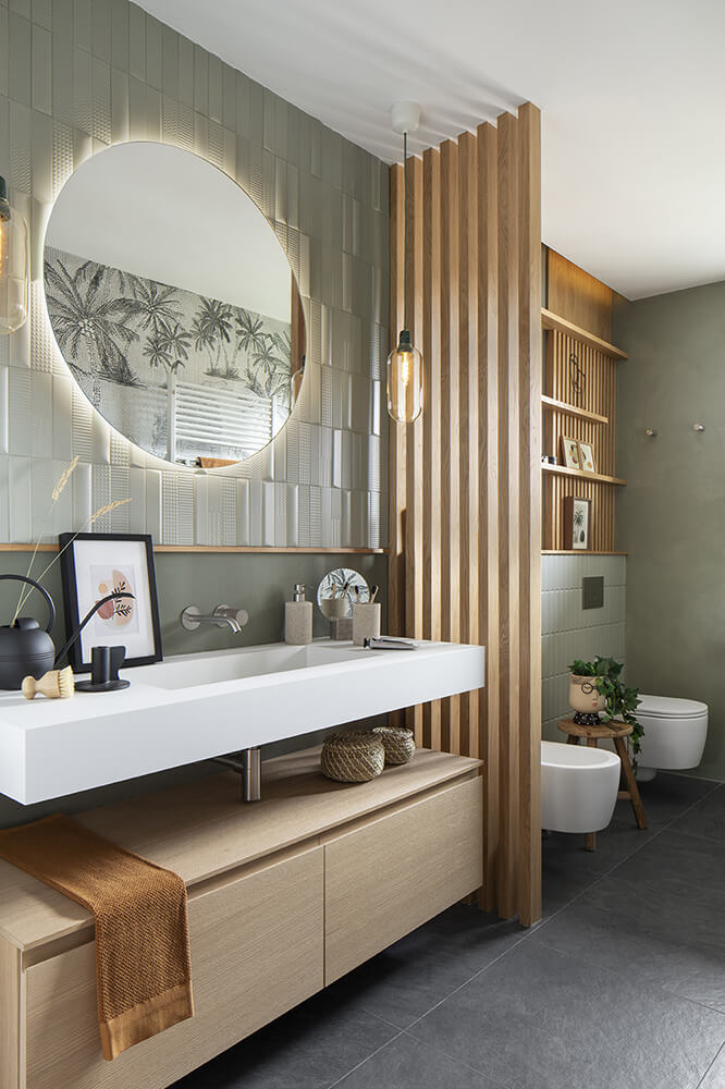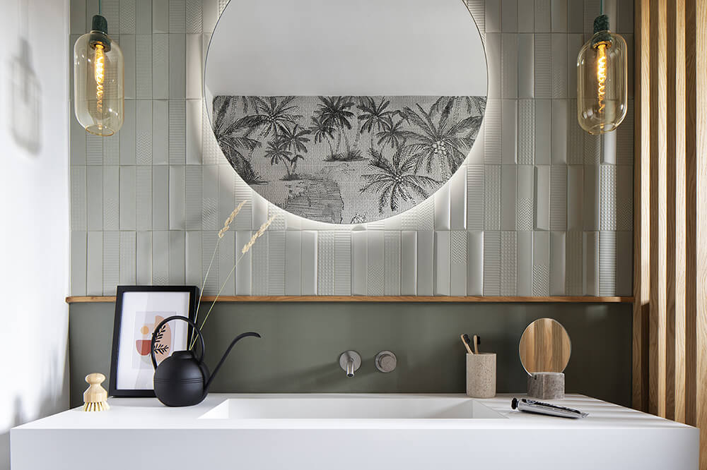 Materials, colours and textures have been chosen to help the reconnection with nature. The use of sage green infuses a feeling of balance and regeneration, associated with natural oak wood and the wallpaper “Exotic dream” by Londonart that reminds of pristine places. The design choice was to enhance the long walls of this bathroom in which one is reflected in the other. The left side holds the large fenix and oak washbasin, separated from the sanitary area through the oak divider. This wall was imagined as a sort of chessboard, where the two-dimensional enamel was associated with the three-dimensional tiles “Biscuit” from 41zero42, creating vertical and horizontal sections through the use of wood. The large circular mirror reflects the fiberglass wallpaper that occupies the entire front wall. The walk-in shower, designed as a real relaxation space, occupies the entire bottom of the room for a comfortable and pleasant use.