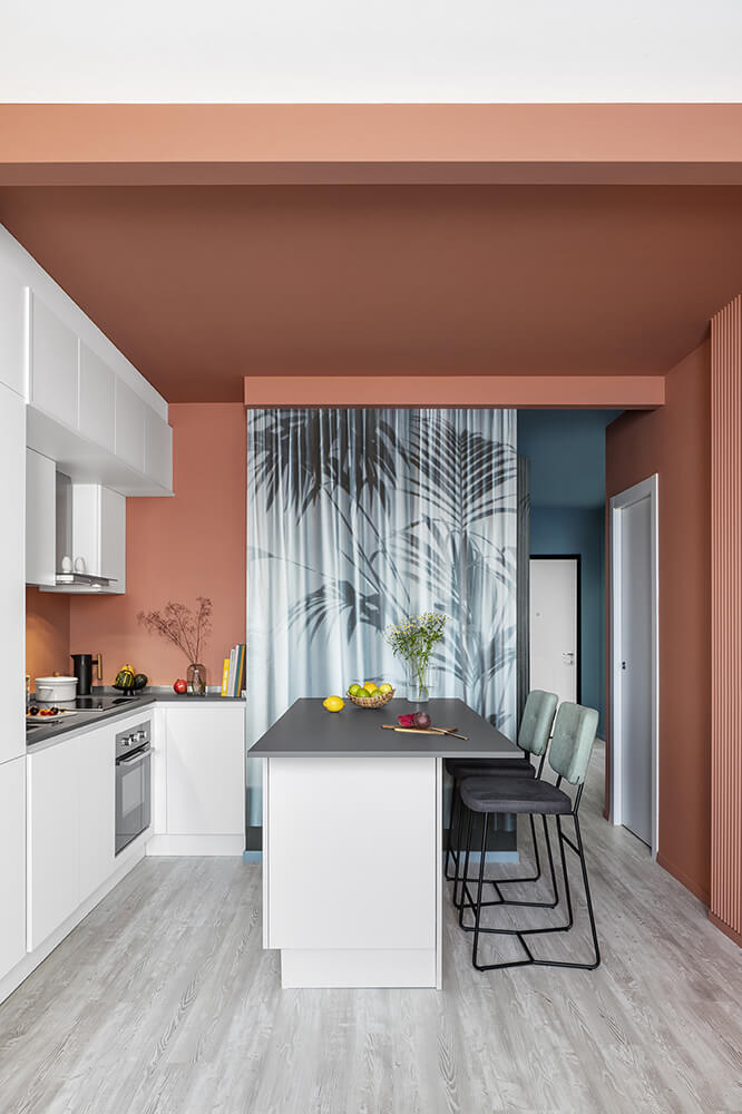 The client, a young independent girl, was looking for a place that could be practical and welcoming at the same time, the ideal home for everyday life but also versatile. By studying her personality, habits, tastes, including her favorite colours, Chroma Studio opted for a soft and harmonious palette, ranging from sage green to brick red passing through the powder blue.