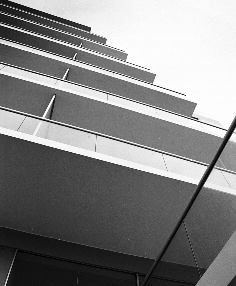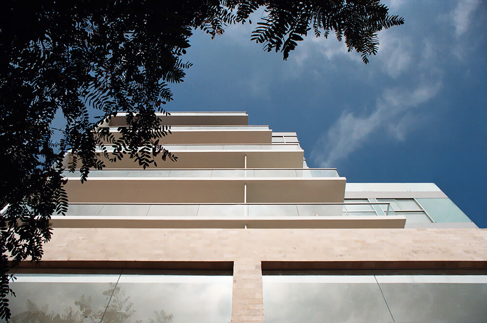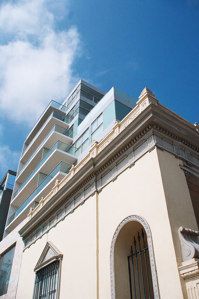 The solution is the gradation in the volume of the building: on the one hand, the stepping of the entire depth of the building, which achieves six stories in the front towards the large house and nine to the side of the adjoining apartment block building and, staggered terraces, from longest to shortest and from bottom to top, which reinforce the desire to lessen the severity of the transition between the two buildings.