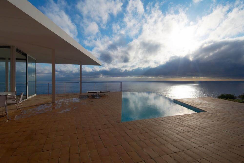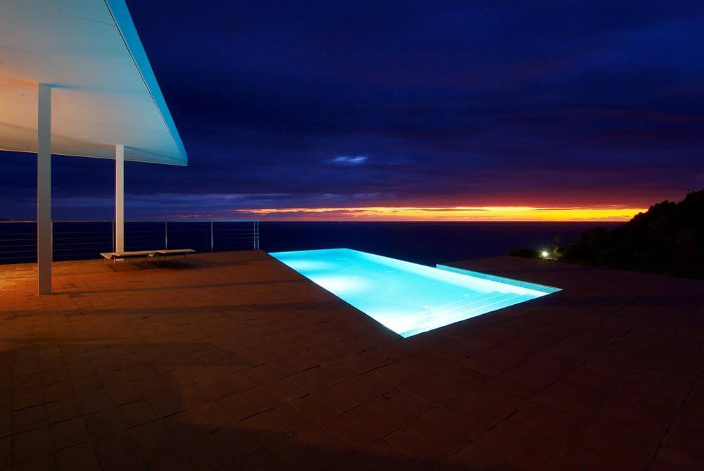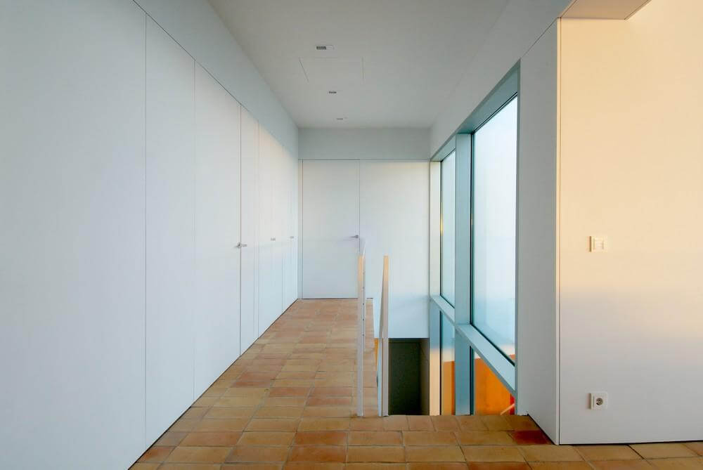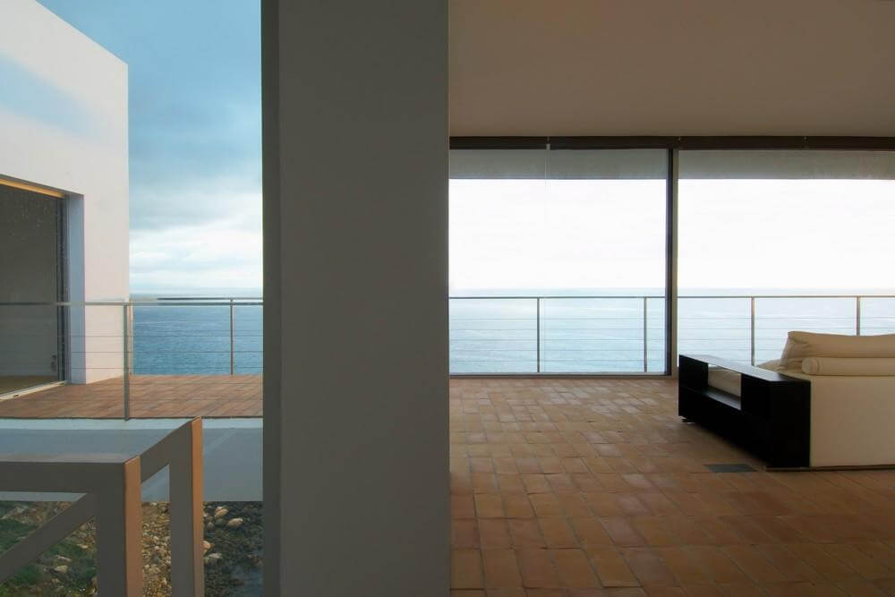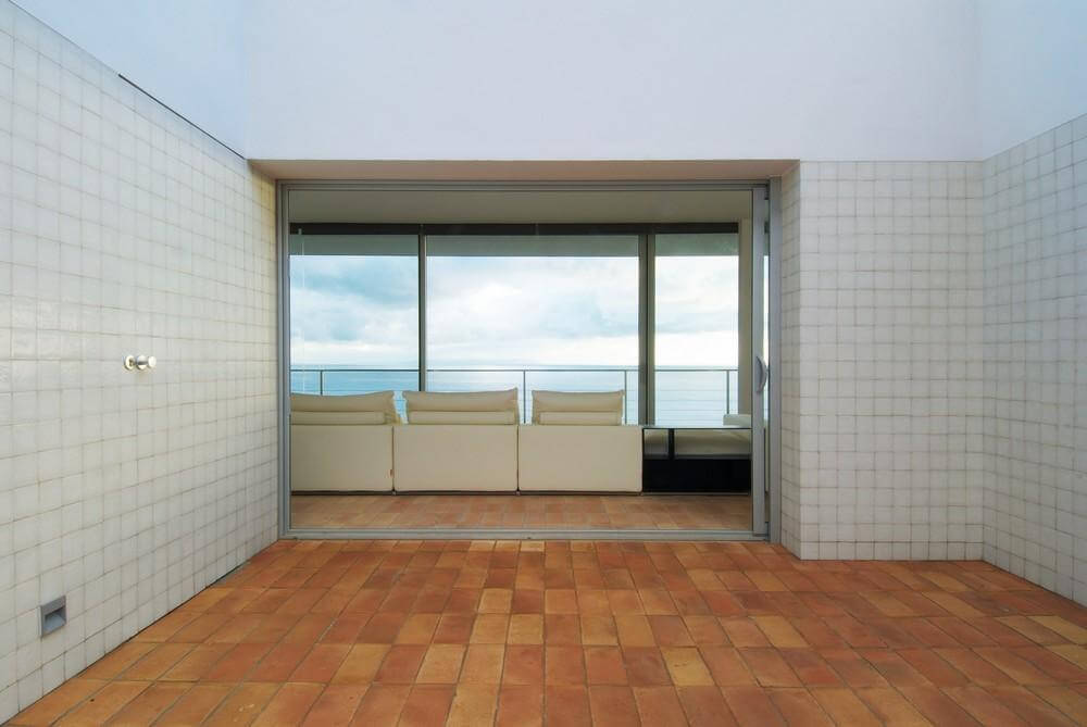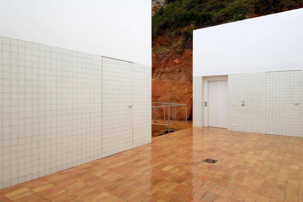 We understand the platform like a prolongation of the landscape and thanks to the blocks of orange stone forms a visual unity. The platform advances over its supports, minimizing the visual contact with the ground, suggesting an area that advances over the difference of level and achieves an elevated position on the hill and its vegetation. So, from the inner of this volume it is difficult to perceive the landscape, seeing directly the sea and facilitating in this way a perception of lightness of the volume from its inner.