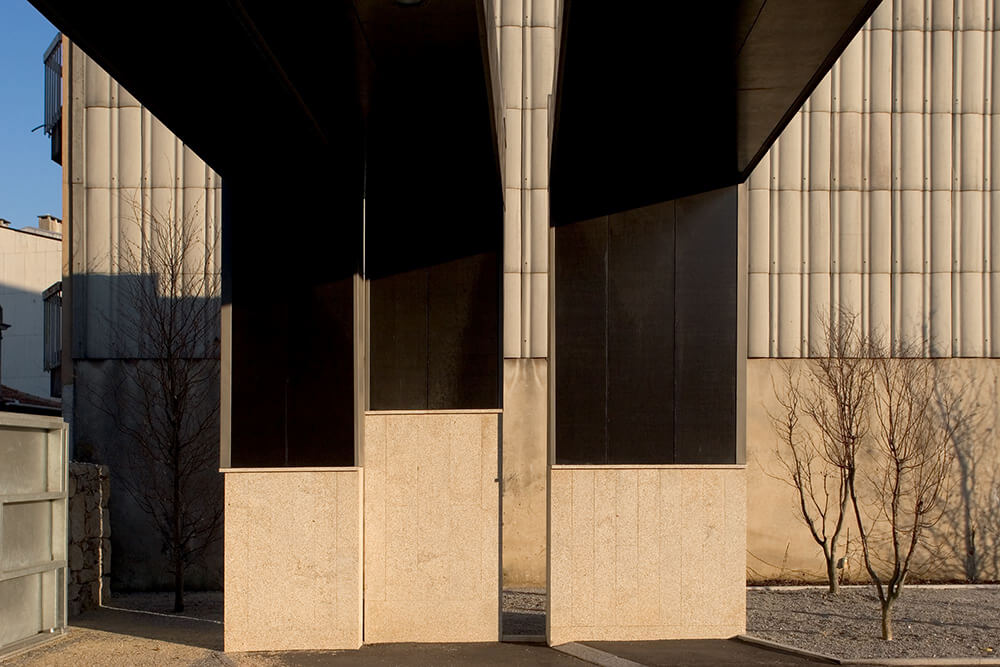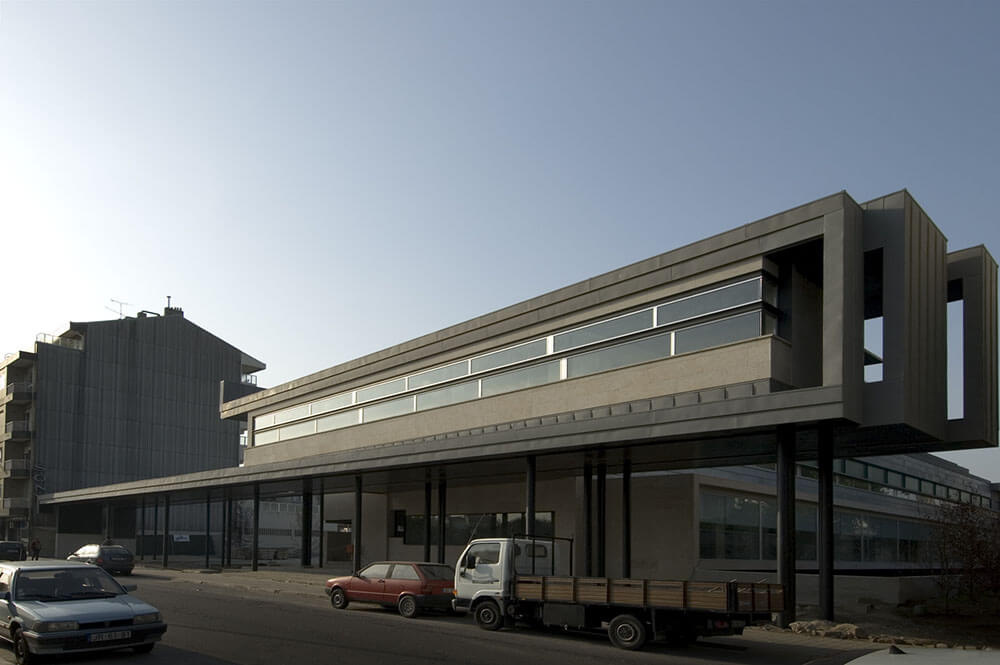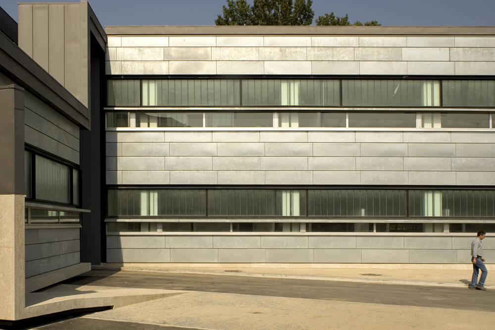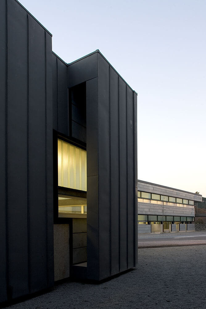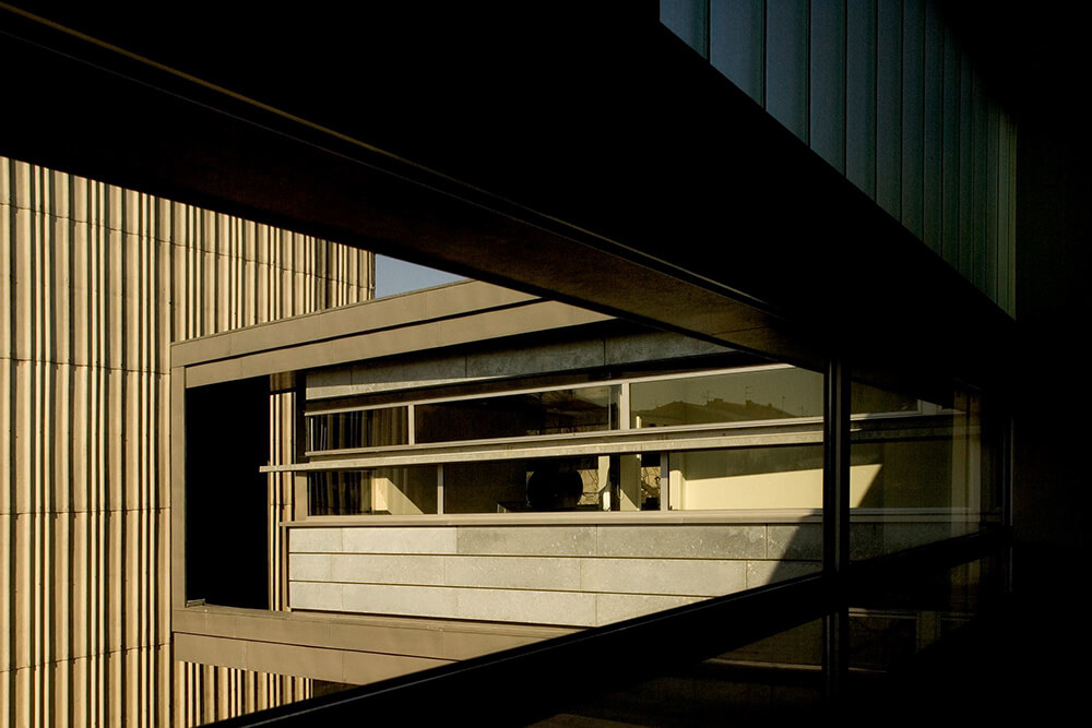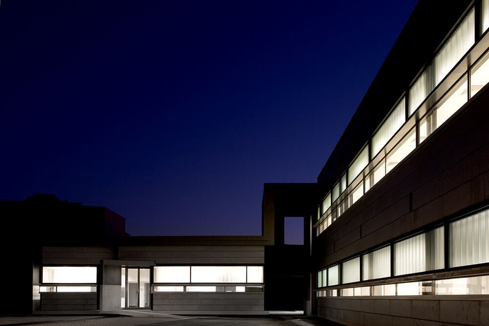 The building-as-line runs through the polygon´s different directions searching its geometry. Along its apparent motion, it comes to stability as different segments of variable conditions: thick and sitting on the ground, floating and thin. The extremities touch the streets gently: the building is lifted on Bolama str. announcing the main (public) entrance’s obvious permeability, peeking over the Covelo Park wall across the street; on the opposite end (Visc. Setubal str.) it becomes a technical arch (service entrance) cutting through the renovated granite wall of the old farm.