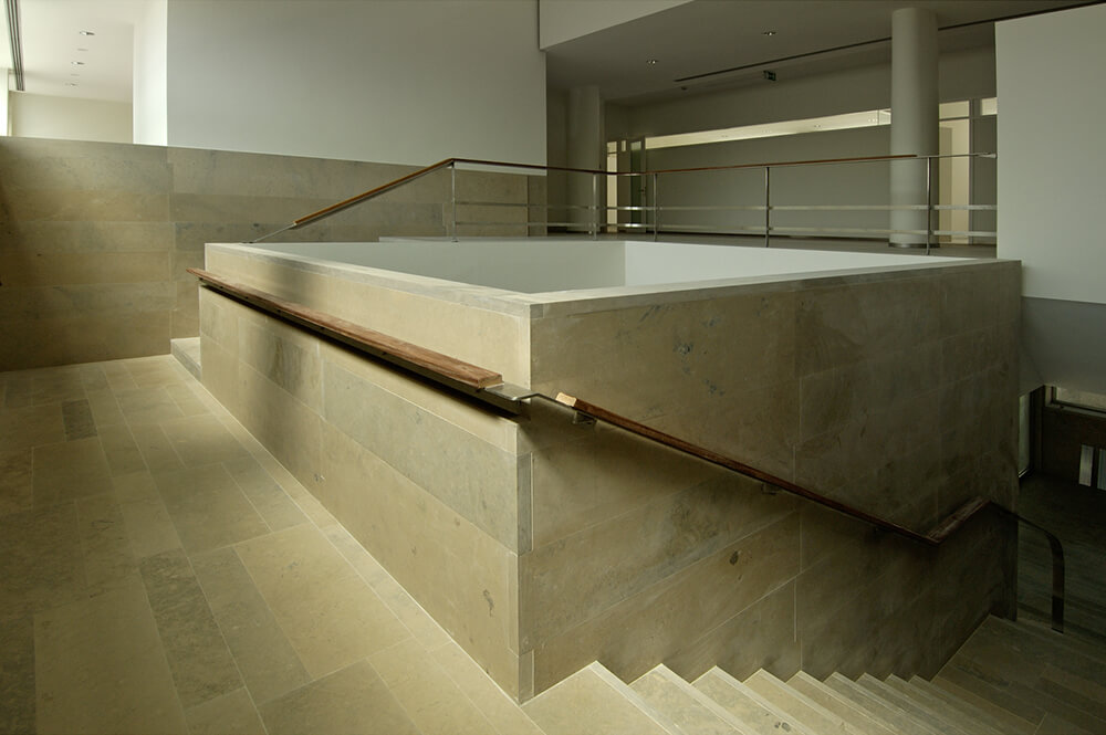 There is no fixed relationship between the content and the container: on the exterior the vertical variation of the window mullions reveals its autonomy from a particular interior layout. Inside materials are always the same, to promote easiness for layout alterations.