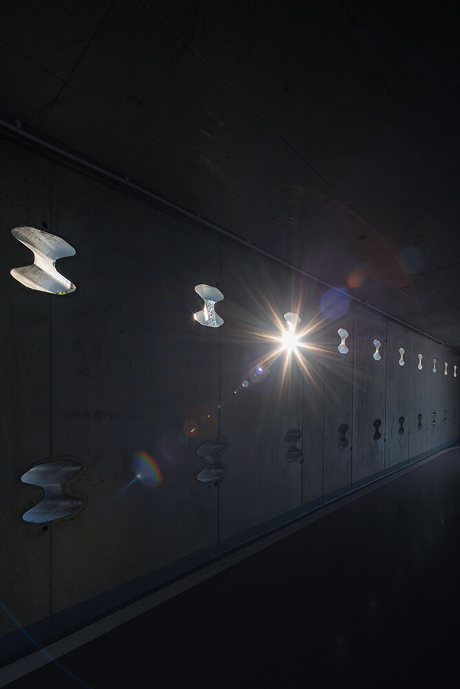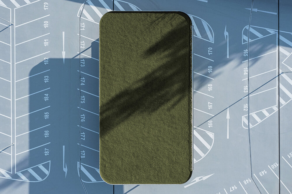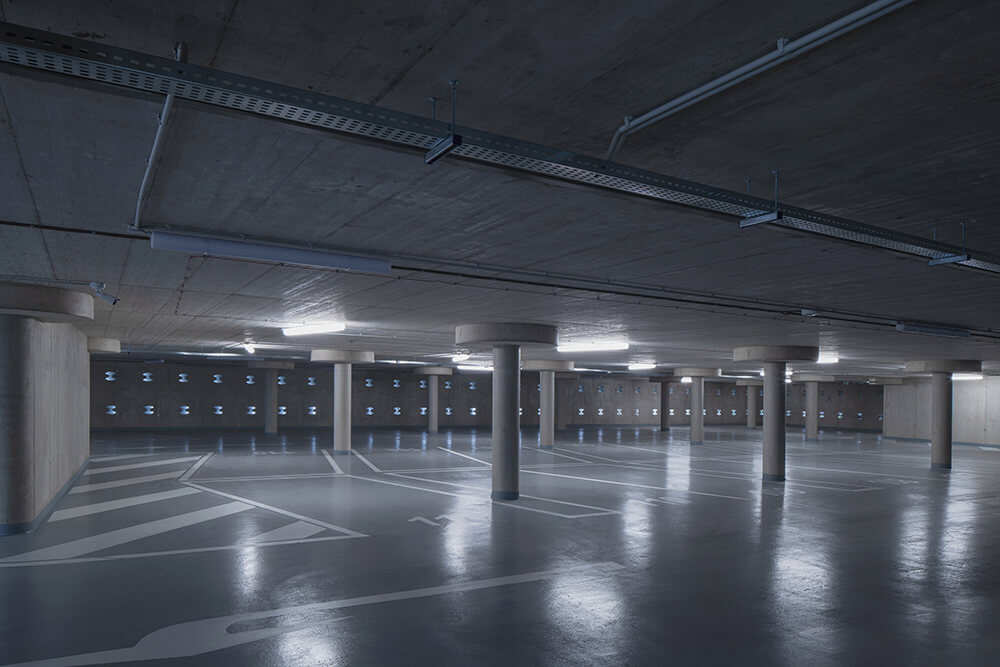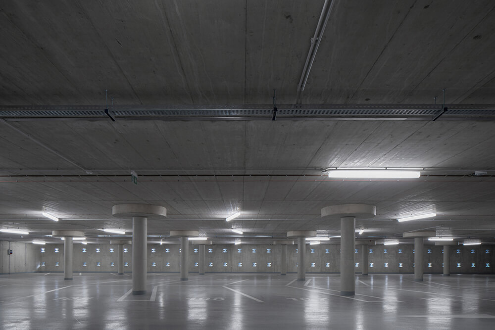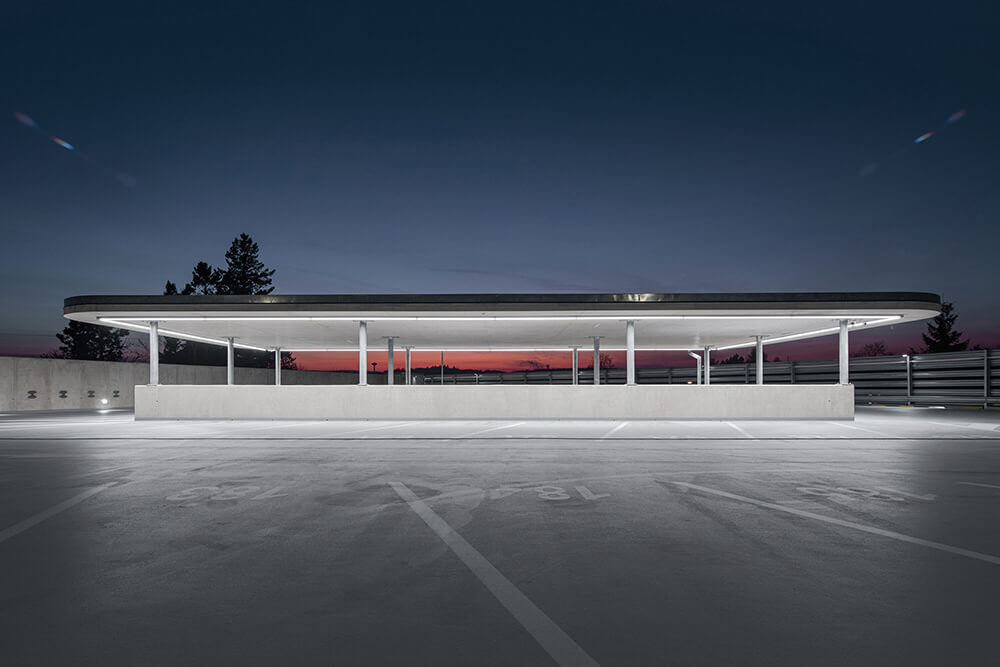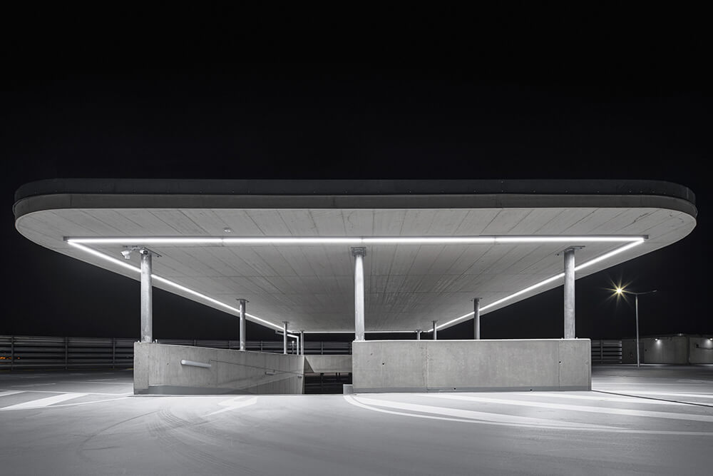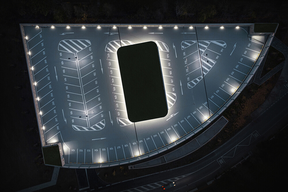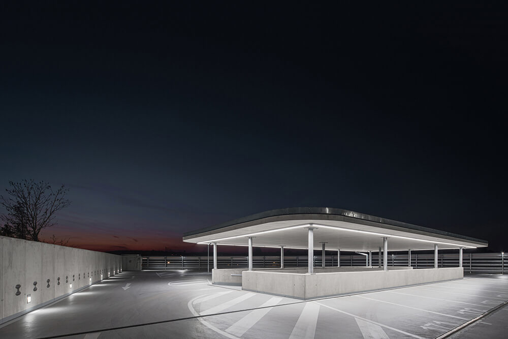The LED lighting placed on the barriers of the northern facade refers to the long exposure car passage. The pond in front of the parking house collects rainwater and thus helps retention to utilize water. The three roofs at the highest level of the building are covered with vegetation. The whole building should drown in the green in the future.