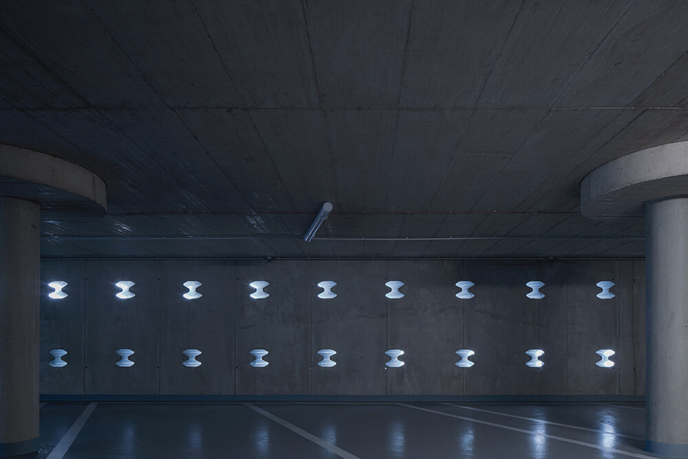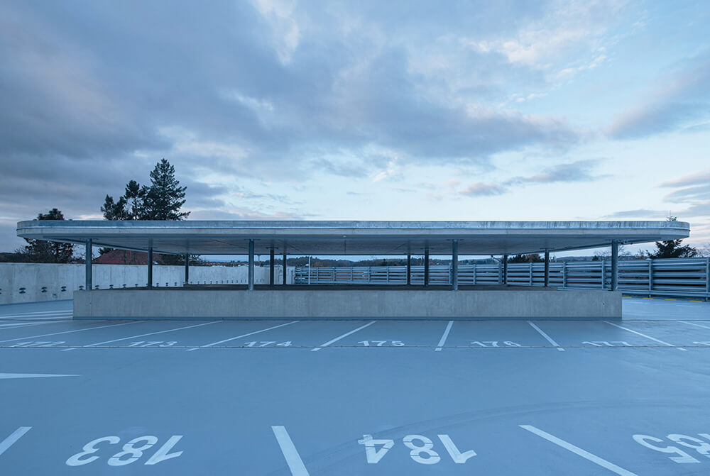 On the plan it forms a triangle with one convexly curved side, it follows slope of the land and respects the terrain. The layout contains parking spaces with a ramp and two communication cores. The facade from the north consists of road barriers with ventilation functions. These barriers are bent to the facade radius = bends. The facades of the east and south are from reinforced concrete with small ventilation holes with diverse pattern and will allow climbing plants to grow. These openings in wall are constructed from fragments of road barriers, the same type such as on the north facade and they are used as lost formwork. They are welded together with different angles. They protect family houses in the immediate vicinity of the parking house from dazzling of car headlights at night. Inside these holes creates filtered interior lighting, scattered fragmented light, similar to what we know from the Orient. Elements of hot-dip galvanized barriers are used in the way that optically and expressively connect all three facades of the building.