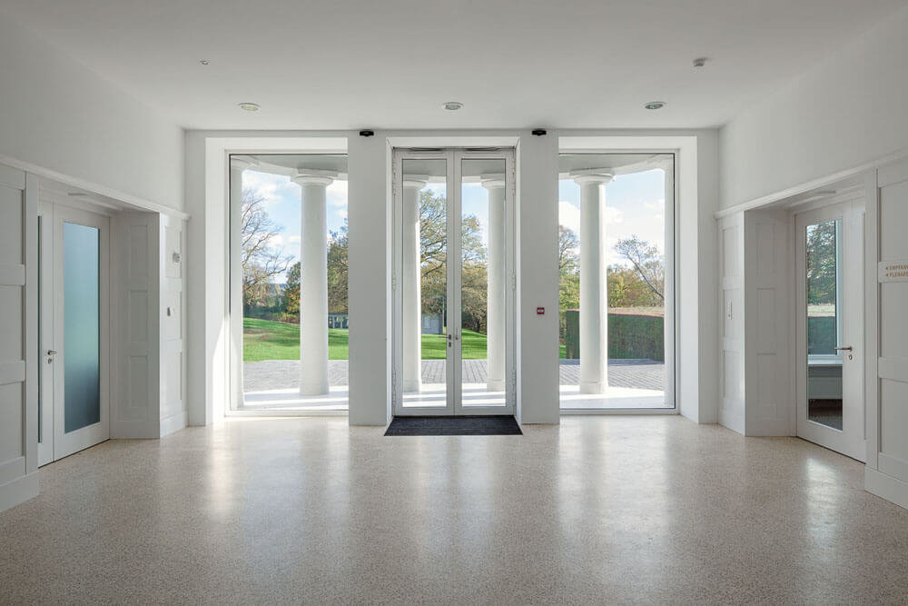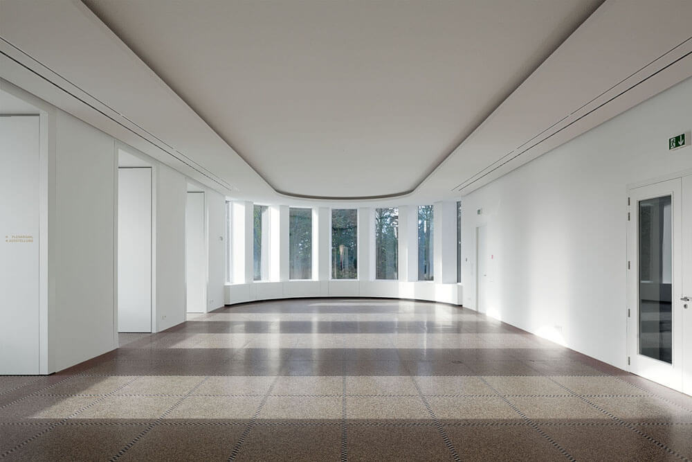 In the interior, architectural attention focuses on the question of the extent at which the different spatial conditions in the old building and the new building can be adapted to each other or designed in a manner that they overflow fluidly into one another. The hall and the new foyer, which due to their partially subterranean position below the sanatorium might quickly arouse associations with a cellar, require special attention. In this case, it is not sufficient to create a bright spatial ambiance by means of windows and skylights. At least just as crucial for the perception of the new building is the spatial scenario of all reception and foyer areas of both the old and the new structures. Along with the large new staircase, the foyer in front of the is given the function of mediating between the old and the new. The foyer is defined by a rigorously symmetrical spatial composition, which links the axial symmetry of the plenary hall and of the staircase with each other by means of large openings in the wall. The walls of the foyer are plastered white, while the floor here and in the hall is laid in end-grain wood, through which a spatial continuity is created. The foyer space thus provides a suitable and flexible framework for representative receptions, exhibitions, and the like. Its symmetry also forms a counterpart to the somewhat axial symmetry of the existing sanatorium. The composition from the outside is therefore coordinated with the interior spatial composition as far as possible. The new subterranean spaces should preferably be staged in such a way that they are ultimately perceived as the brightest.