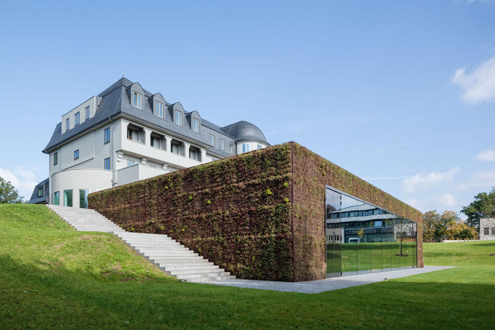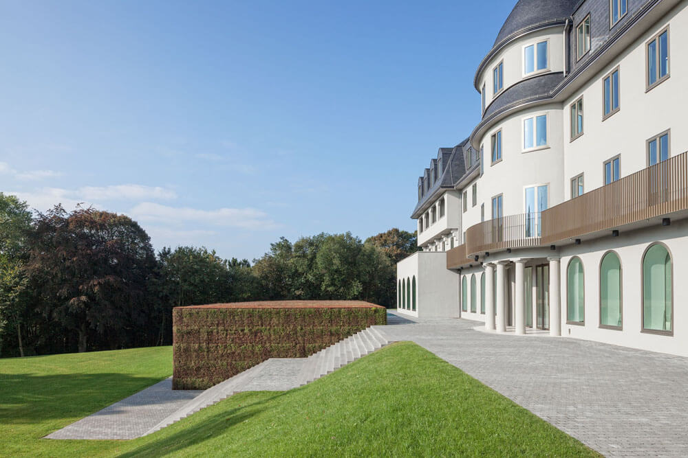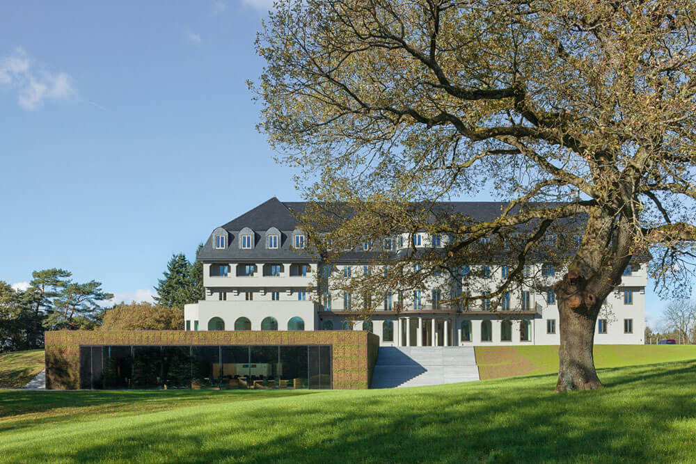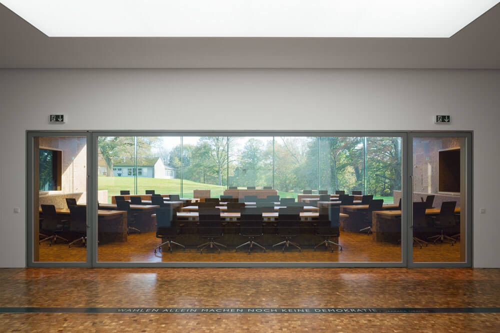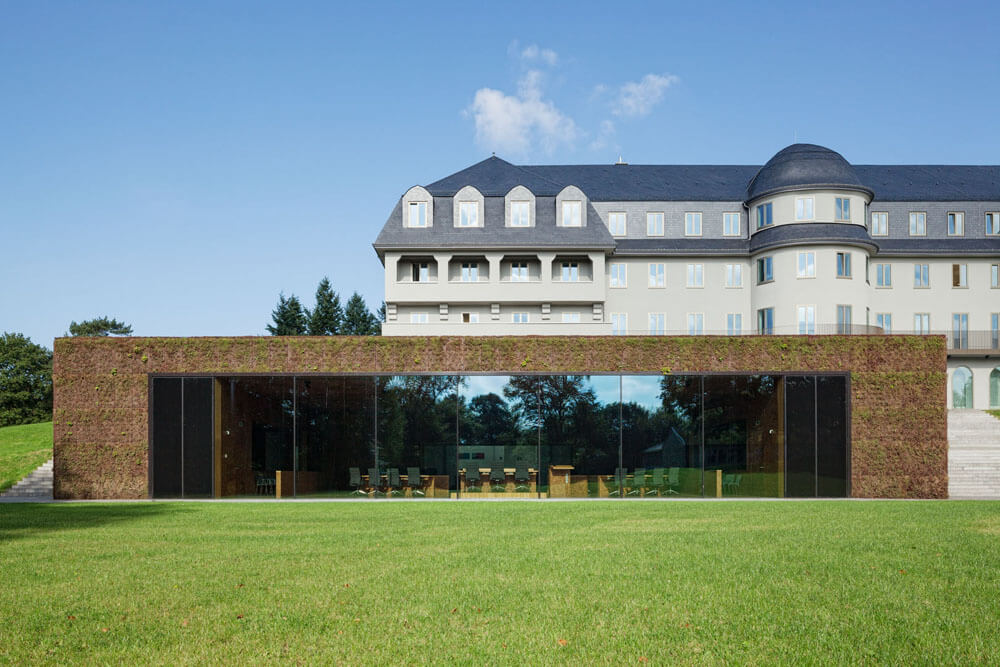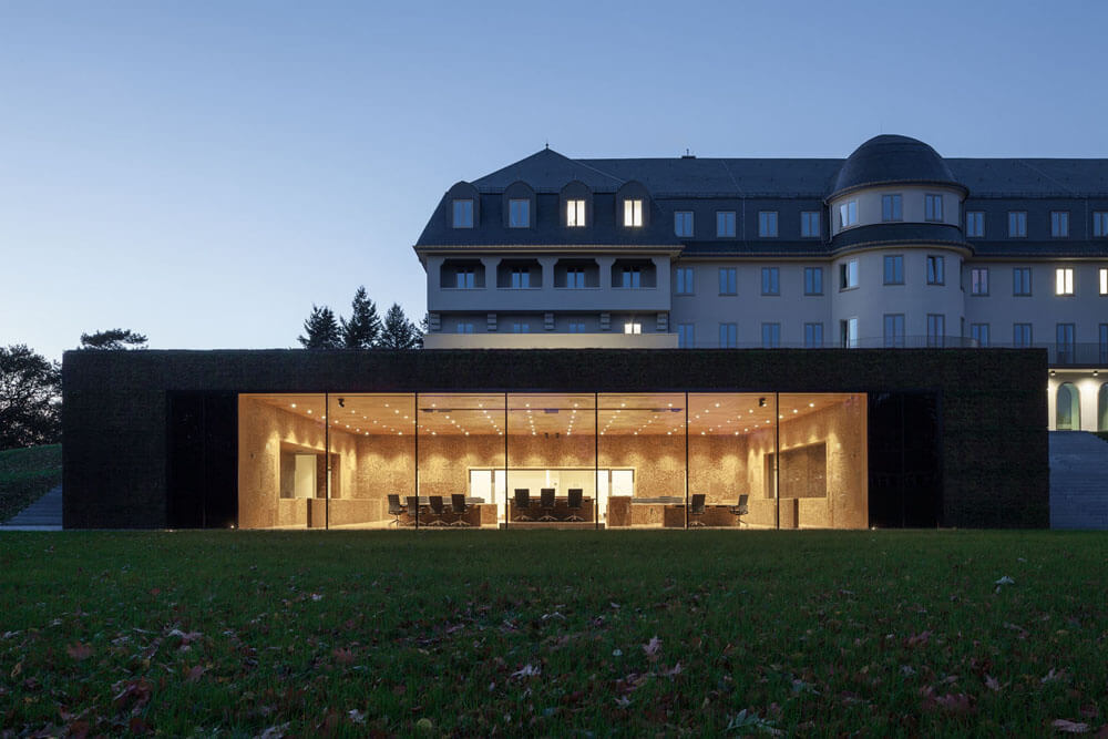 Both the competition design and the variant to be realized have the goal of uniting the old building and the expansion into a coherent composition in which the two buildings are each given their own character while nonetheless forming an architectural unit. The particularly delicate issue here is the position of the already existing sanatorium on the hill like a freestanding manor house. With a very representative appearance that is laid out in a classicist-frontal manner, every form of expansion can quickly be perceived as an insensitive intrusion or as too reserved. Atelier Kempe Thill’s design thus originated with the idea that the new building would be positioned visibly and offensively with respect to the old building as befits a representative parliament building. As a result of the nature of the hill on which the “sanatorium” stands, it was possible to position the new building directly in front of it through a simple reshaping of the terrain. Seen from the outside, the already existing building is not simply combined with a new building but instead enters into coherent synthesis with it. The new building forms an optical plinth for the “sanatorium,” which emphasizes its solitary appearance architecturally and symbolically. The roof and the exterior walls are completely covered with sedum plants. This results in the creation of the impression of a large “flower pillow” in front of the entrance to the entire complex, which generates an inviting atmosphere. This “landscape object” counters the naturally appearing nature of the park with the seemingly staged nature of an overgrown minimalist object. The new building is thus both a part of the landscape as well as a contrast to it.