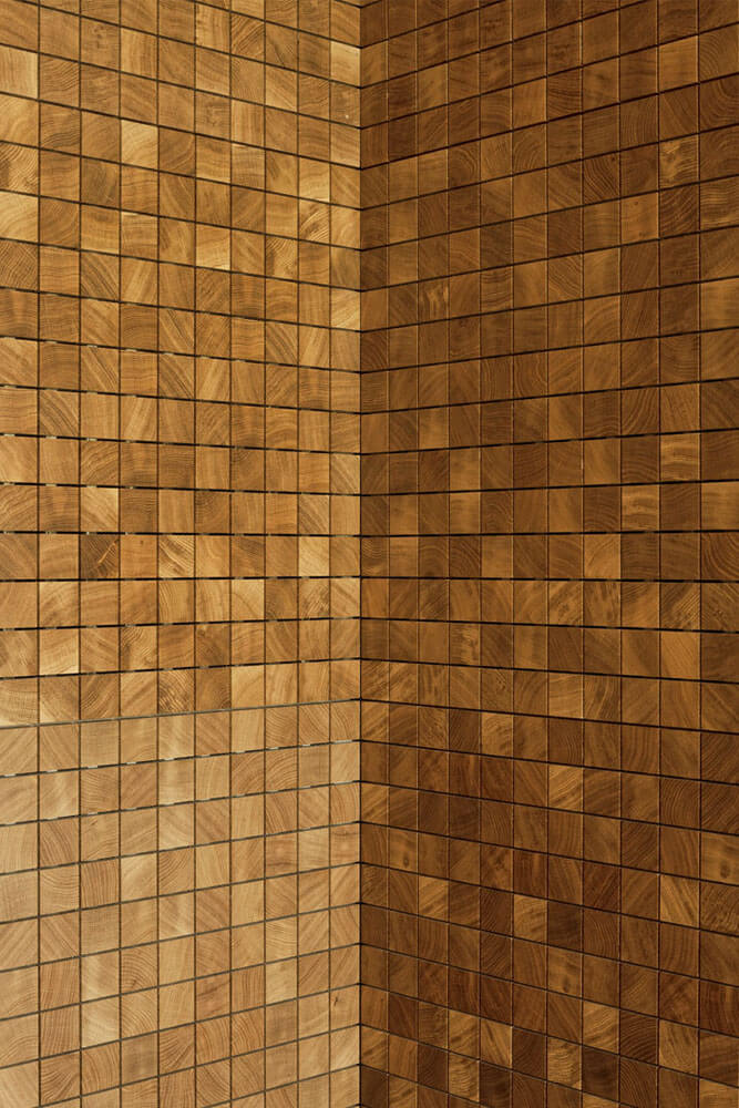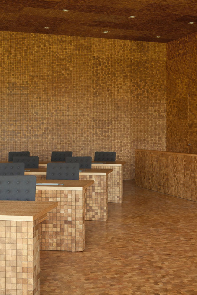 As a result of the positioning of the new building, the plenary hall is first provided with ideal conditions for an interior space. It is given a calm spatial character with an excellent view of the generous park in front of the building, so that the landscape becomes a fixed component of the interior. The parliament selected wood as a basic material for the hall. This is meant to form a link to the traditional wood culture of the region, with its cabinetry and carpentry, which arose from the forests of the Ardennes. Atelier Kempe Thill takes this desire for the use of wood literally and proposes a consistently wooden hall with a monolithic, calm, and modern spatial impression. The acoustic requirements are crucial here: since the hall is laid out for speech, it requires strongly absorbing room acoustics. Because veneered acoustic panels are not suited to the architectural requirements of an integrated concept, specially developed wall panels on the basis of end-grain wood parquet were proposed. End-grained wood parquet is normally used for flooring but can, however, also be used for various other purposes as a result of its being put together from small blocks of solid wood. And since it is also used for the floor here, what is created along with the wall panels is a simultaneously uniform and slightly varied appearance of walls, ceiling, and floor along with the permanently installed tables. With the blocks having been installed with three-millimeter-wide joints, it is possible to architecturally incorporate all the technical requirements – such as sound absorption, integration of ventilation, joints around doors, et cetera – without visible grates, air vents, and the like, thus fostering a consistent spatial ambience.