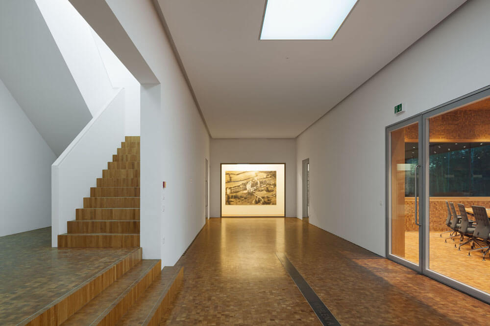 The large wall openings from the foyer to the hall are glazed and form a large picture window that allows a view from the foyer through the hall and into the park. This window is combined with a large, vitrine-like window at the front end of the space in which art will be shown, illuminated by a skylight. This lends the space a bright and airy character, which is emphasized even more by a generous, central skylight and the multifaceted visual relationships that are created.