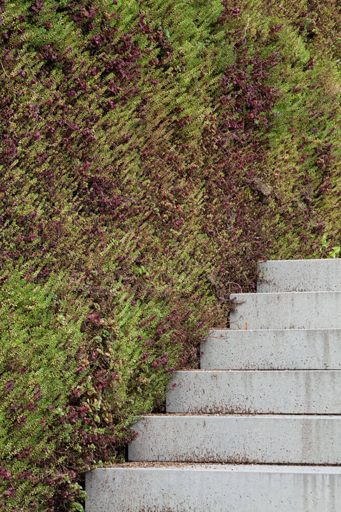In the variant to be realized, the new building had to be reduced in size due to budget constraints. In its extension, a broad flight of steps is situated directly across from the main entrance to the old building. As a result, the landscape character of the new building is somewhat decreased and what is created instead is an object. The flight of steps takes up the axial symmetry of the sanatorium to a certain extent and thus links it architecturally with the landscape and the new building. By aligning the plaster of the façade of the sanatorium with the color and texture of the ashlars in the outside space, and also by damping the intensity of the new building’s landscaping colors, a strong compositional coherency is created despite the different conditions.