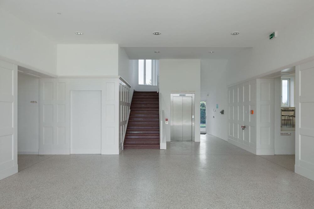 The sanatorium was strongly disfigured, mostly as a result of renovations in the nineteen-sixties and seventies. The renovation proposed therefore initially has the goal of substantially restoring the integrity of the sanatorium, and the original appearance of the building at the time it was created served as the basis for this. All existing details in the interior, such as the terrazzo floors in the halls and staircases, are repaired and supplemented in matching colors. The existing doors to the rooms in the connecting corridors are authentically rebuilt. In the case of the windows, it is necessary, in contrast to their original design with shutters and many divisions, to find an equivalent for the technical conditions of today. Compared to the earlier windows, the new ones are only divided in two vertically so as to achieve an elegant appearance despite the thicker, modern double-glazing as well as the thicker window frames. Adaptations also have to be found for the detailing of the roof as a whole, since as a result of the necessary thermal insulation, the position of the dormer windows is slightly shifted and their proportions change. Slate is used for the roofing in order to reflect the original roofing.
