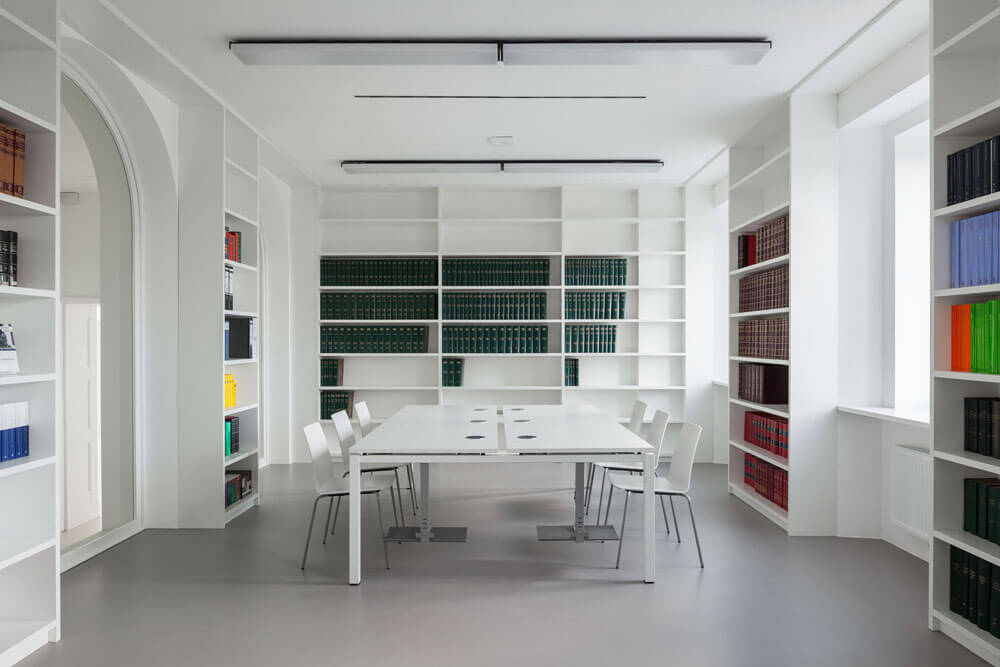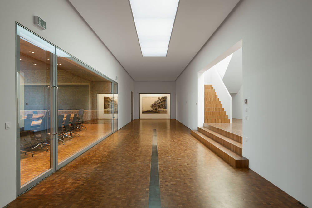 Beyond considerations of the materials used and the individual details, a larger conceptual problem is encountered: one of the requirements is very high energy efficiency in order to achieve low-energy standards, which, according to the most modern requirements, far exceed the original construction of the building and are supposed to be carefully integrated into the overall concept. To this end, very high-quality thermal insulation and, most especially, the integration of a ventilation system and new heating system based on pellets are of crucial importance. Moreover, a system is integrated for cooling the building by means of an adiabatic process based on the evaporation of water. This results in roughly five hundred drill holes needing to be made in the walls and ceilings, which thus severely impacts the quite fragile ceiling construction dating back to the building’s original structure. For this reason, some of the ceilings have to be replaced. So many channels are required for the ventilation system that the corridor is nearly incapable of accommodating them. Furthermore, suspended ceilings, which severely impinge on the proportions of the space, likewise become necessary.