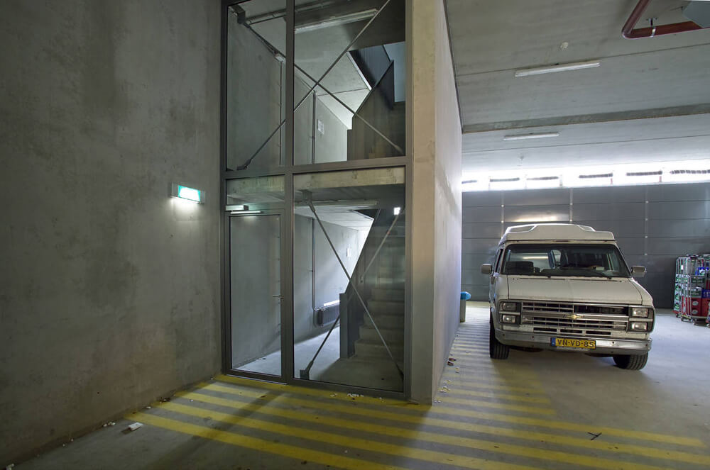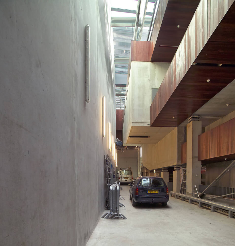 Haarlem’s pop music venue – a commission that resulted from a European tender – consists of a foyer and a large auditorium stacked on top of a smaller one. This made it possible to just fit the programme – and meet all of the acoustic requirements – in the prescribed building volume. An internal street runs through the building, facilitating loading and unloading. Trucks enter the building via a residential area at the back and after a concert they leave again via the huge garage door at the front, without disturbing the sleeping neighbours.