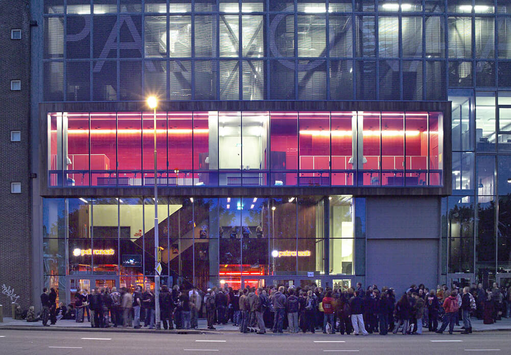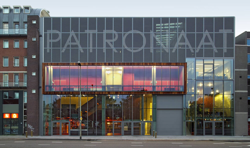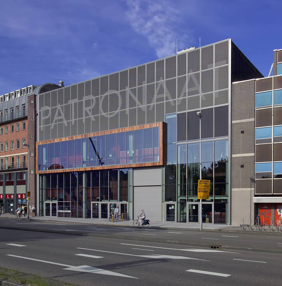 The building invites visitors to roam to the stage, the bar, the balcony and, last but not least, to the lavatories, which are an important meeting point at pop concerts. Therefore they have been given a prominent position in the building, immediately behind the glass facade, which, especially at night, displays as much of the movement and activity inside the building as possible. The top floor, behind the letters that spell the centre’s name, houses most of the building’s sizeable technical facilities. Both the large auditorium (which holds 1000 visitors) and the small auditorium (with a capacity of 300) have asymmetrical balconies, which enhance the acoustics. These balconies also enrich the experience of the visitors, who may circle the auditorium and look at both the band and the audience. The Patronaat as a building really comes to life at night. During the day, it shows its civilized side, fitting in with the streetscape through repetition of the motifs of the adjoining architecture on its left and right sides.