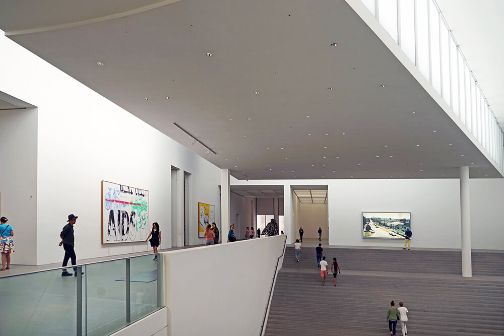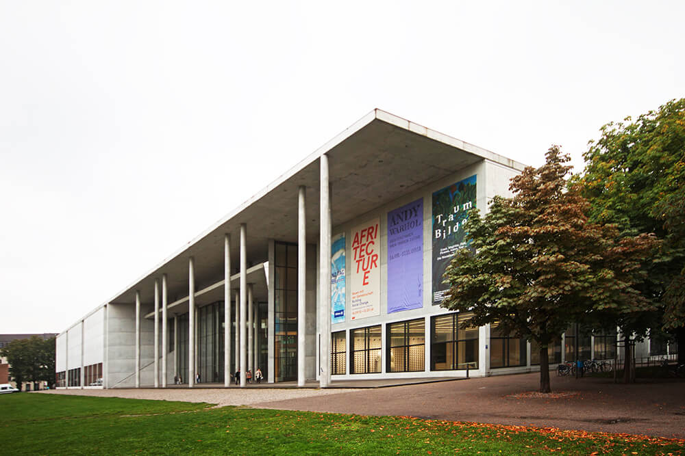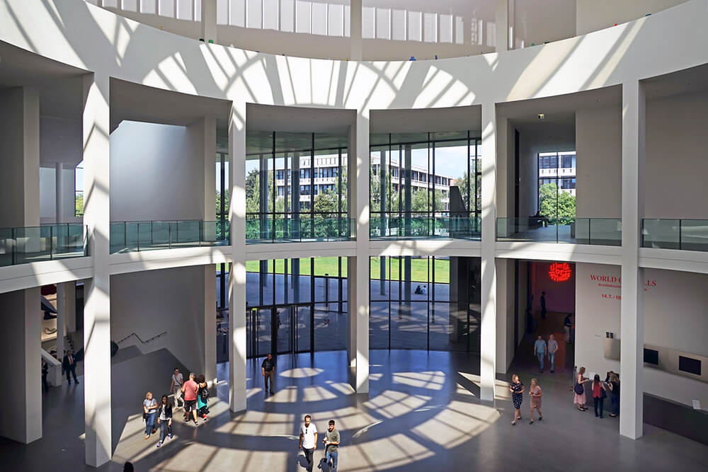 Pinakothek der Moderne is a museum designed by the German architect Stephan Braunfels that was inaugurated in September 2002 after it took seven years to be completed. The museum’s rectilinear façade is dominated by white and grey concrete and interrupted by large windows and high rising columns. Those columns support the extensive canopied roof. Each of the four corners of the building, connected by a central rotunda, is dedicated to a special collection. The Museum is thus divided into Art (Kunst), Architecture (Architektur), Design (Design) and Works on Paper (Graphik).