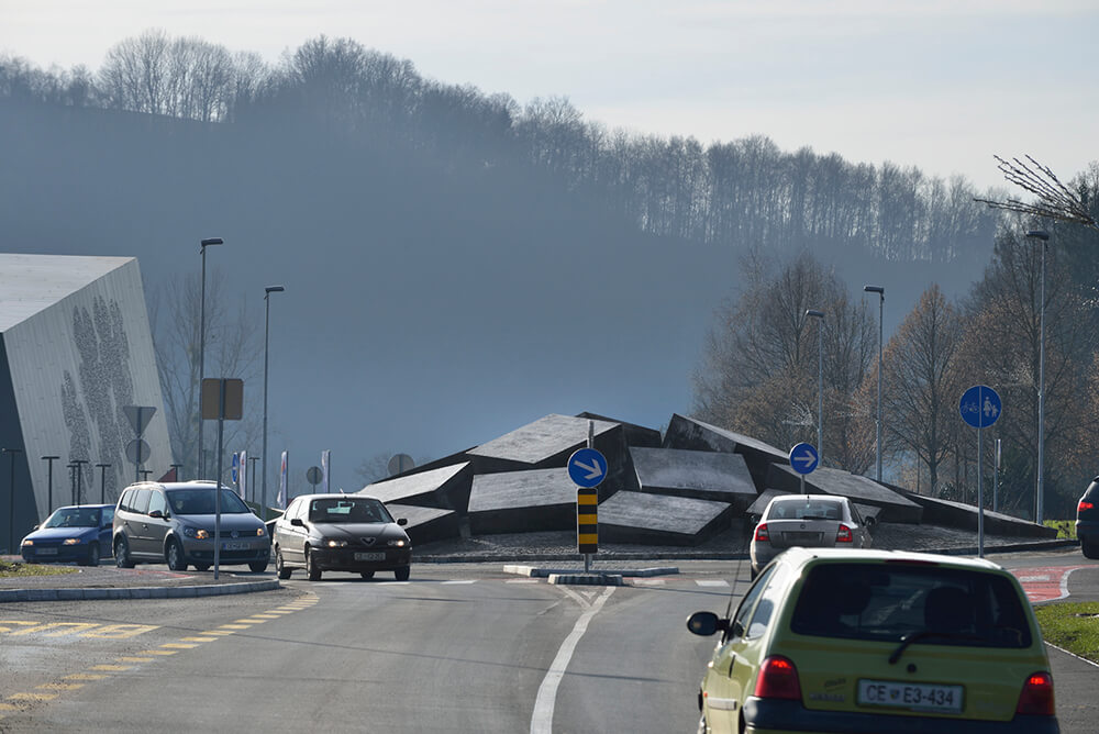 The Podčetrtek Traffic Circle is built on a regional road located between the municipal sports hall with open-air sports grounds on one side and a spa centre with numerous swimming pools and hotels on the other side. It is primarily intended to slow down the traffic in this consequently very busy area as the main accesses to both complexes also connect to the traffic circle. The design of the roundabout’s central island thus references the appearance of both facilities and marks the entrance points to the destinations of the visitors to either of the programme centers.