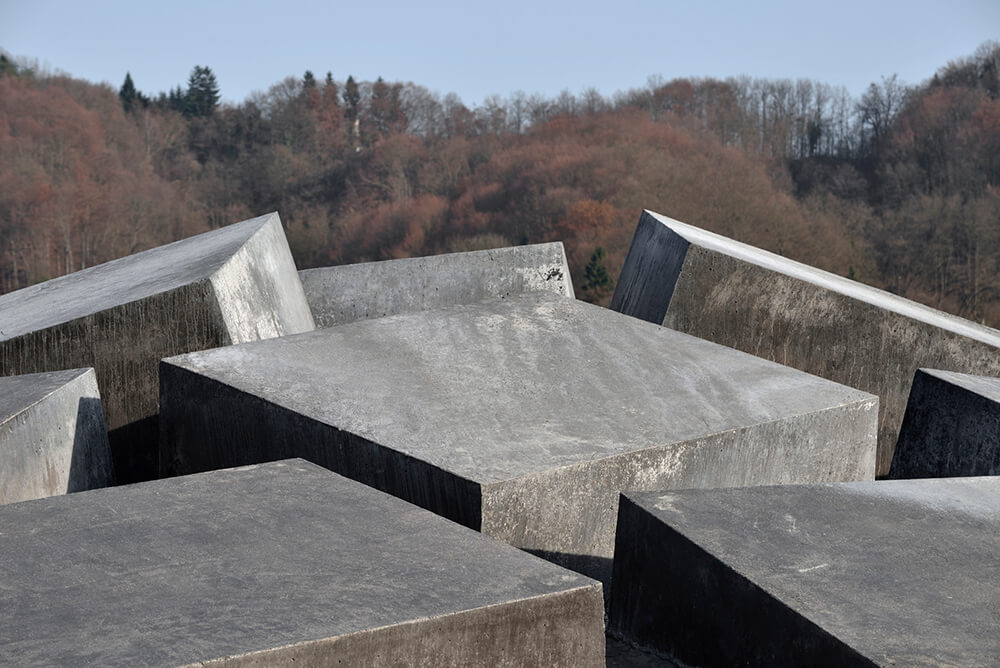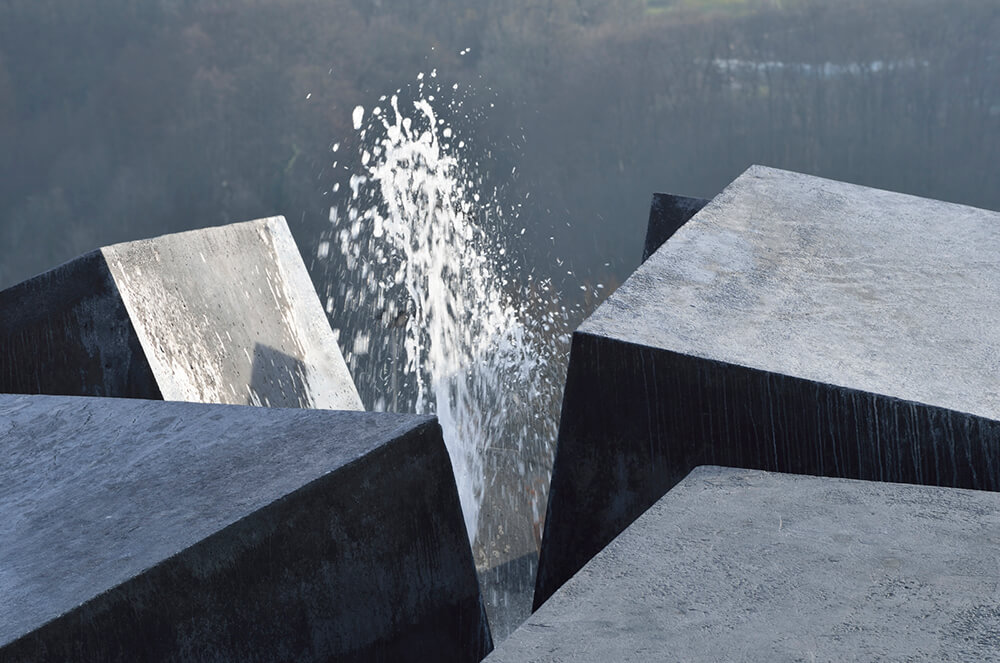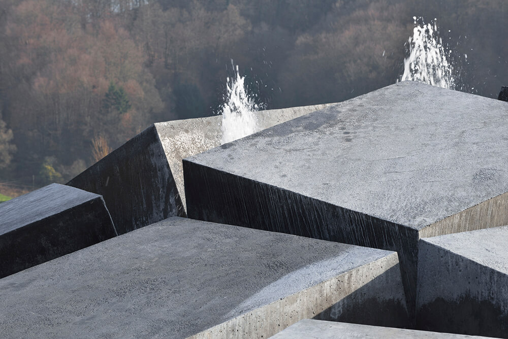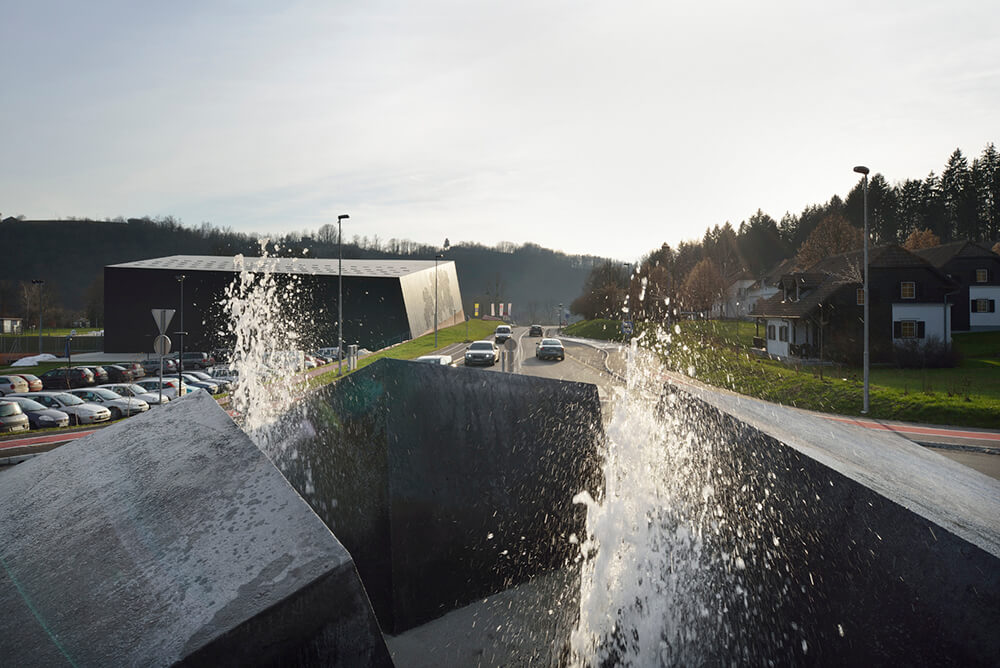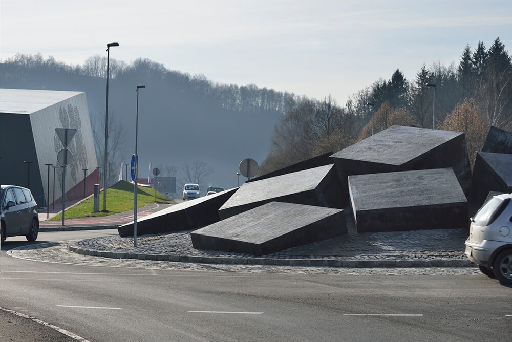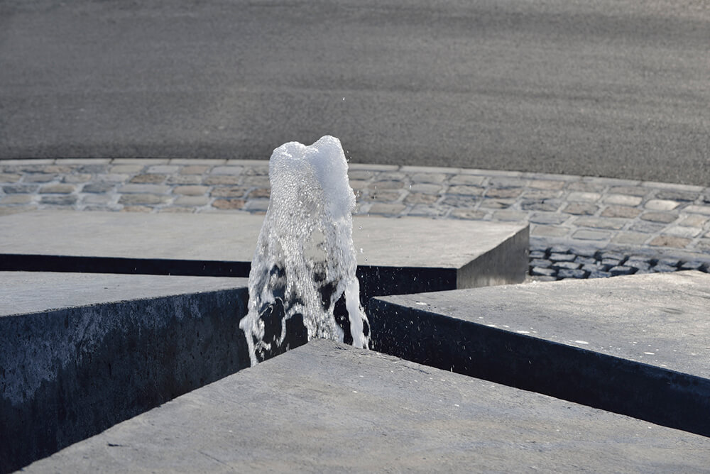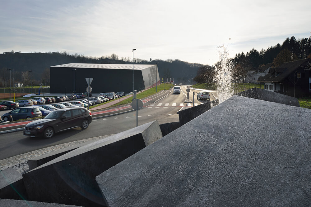 The large, dark concrete blocks allude to the design the monolithic volume of the sports hall. The play of light on the irregular arrangement of the elements forms a composition of surfaces, which corresponds to the expression of the hall’s folded volume. The layout of the inner part of the roundabout as a whole suggests a tectonic shift somewhere beneath the Earth’s surface having caused the road surface to bloat and belched out the massive blocks. In combination with the water, which sporadically rises to the surface between the clefts, it is somewhat reminiscent of geyser-strewn basalt strata, its appearance thus also evoking the spa complex.