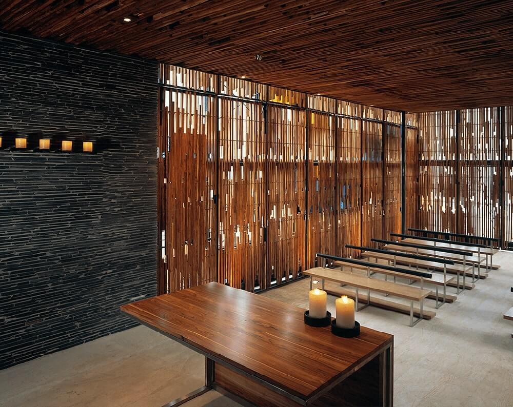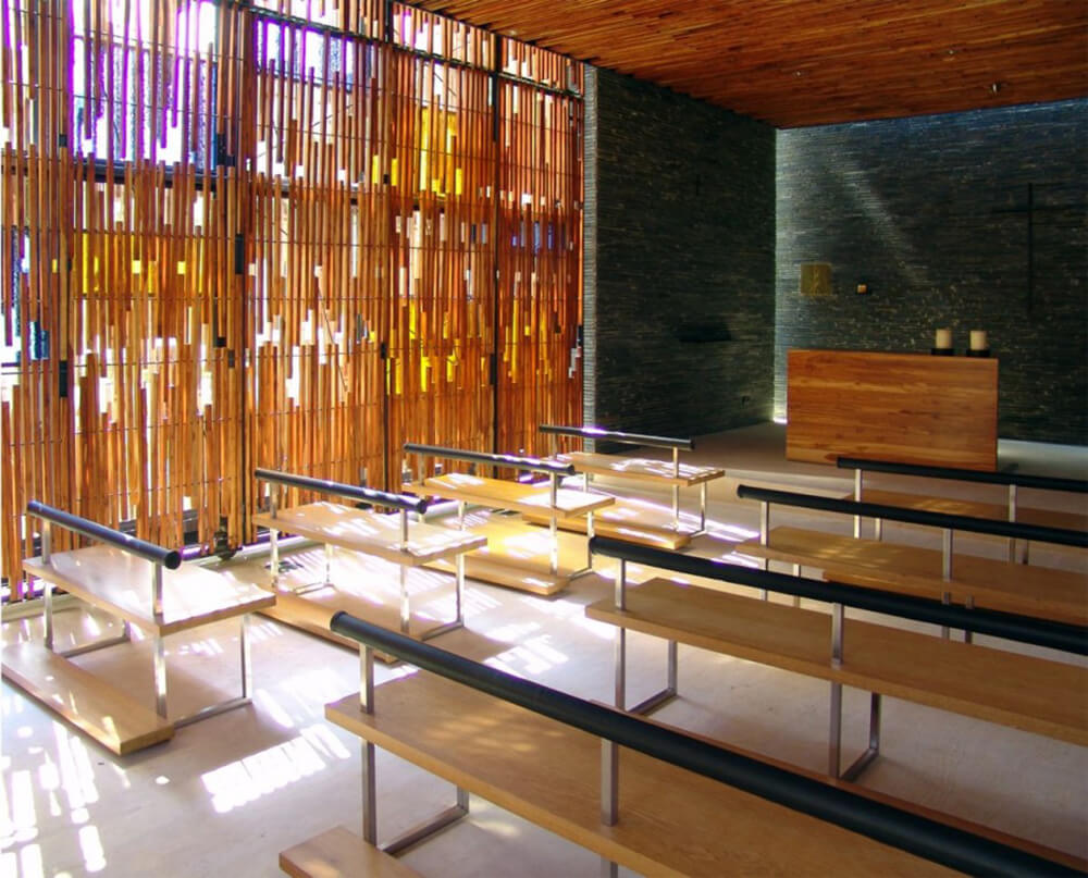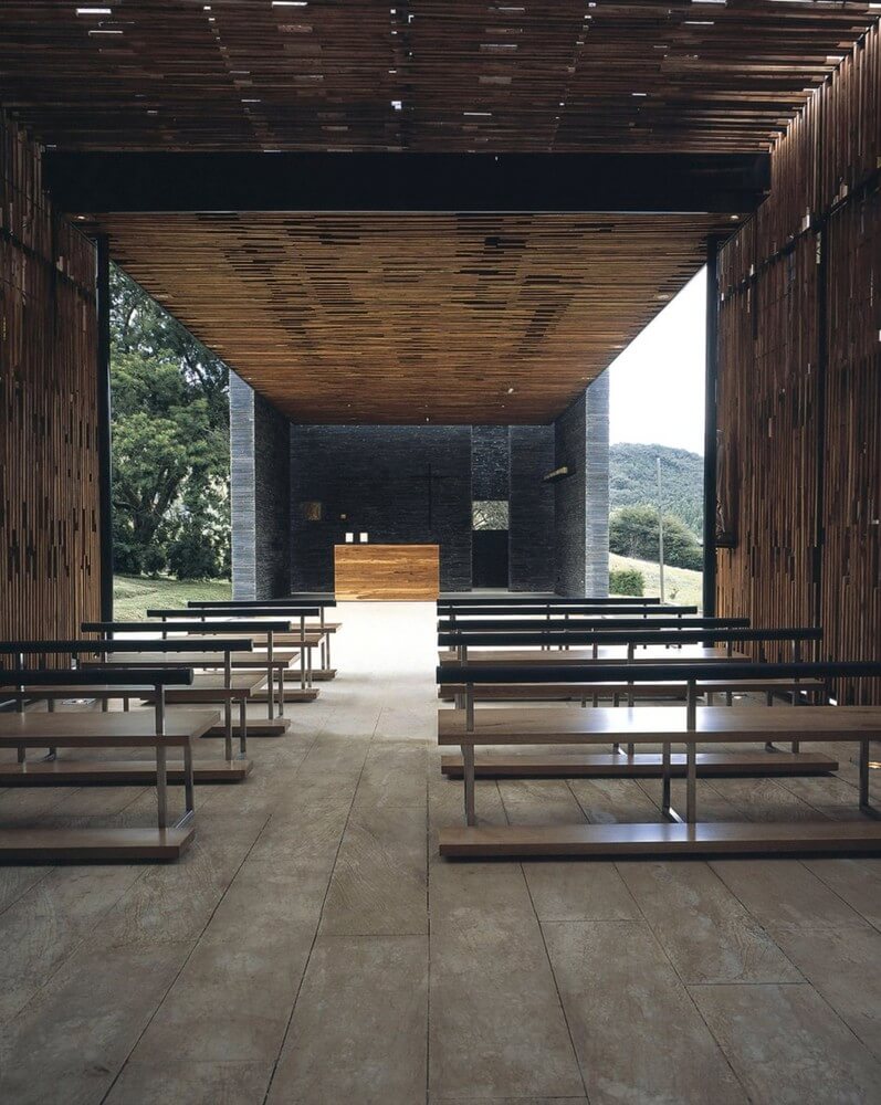 The materials work on these same principles, they mimic the natural surroundings. In this way the rigid structures are static as the stones, while the mobile body made of steel, glass and wood form an interwoven design. The reflecting pond, on one of the chapel’s sides, dilutes the massive structure into the landscape, and it also accents and distorts the volume to make its density fade away.