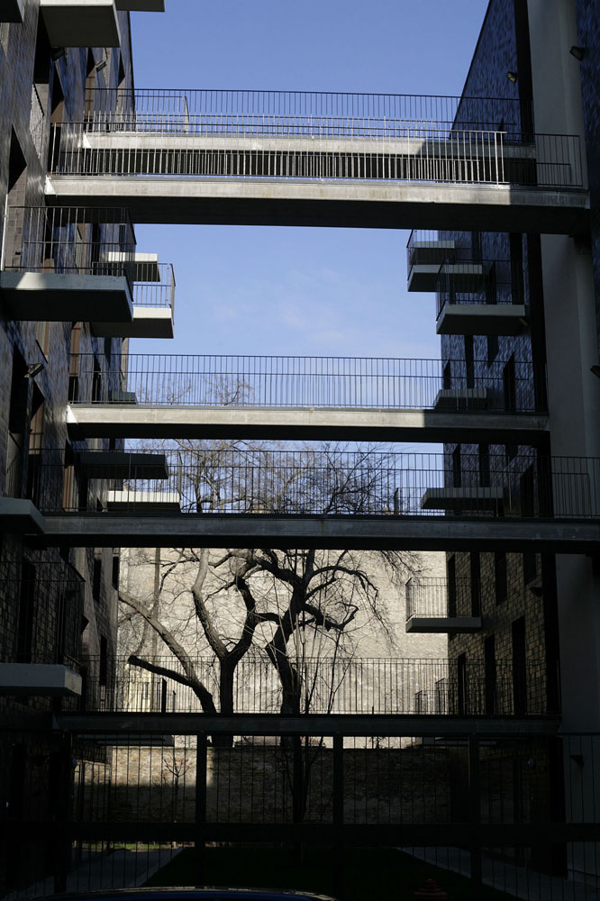 We reacted to the form and volume of the sorrounding buildings observantly and sensitively. This way of designing gave us the possibility to add the new building volume in a wider sense. We integrated the block that sorrounds the location in two levels. On the one part, the new building covers the fire walls, on the other hand, the moulded block evokes them. The new volume finishes the sorrounding blocks, at the same time it marks the difference by the change of material.