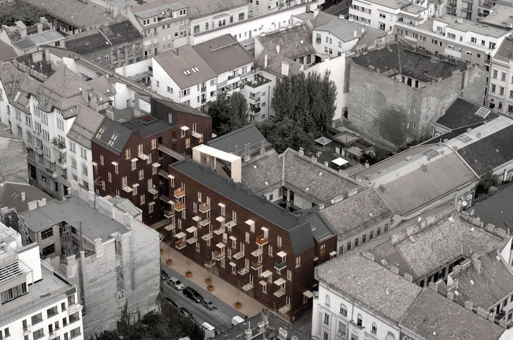 Our firm will was to generate the development of the certain site, the sorrounding blocks and it’s wider environment. The integrated building form generates an inner garden, that visually connects the street to the inner space of the new block. Besides giving the green experience to the space, this solution lets natural sunlight in, it gives natural light to the inner street and apartments. We connected public spaces to this inner garden, that adds a certain value, and completes the simple function of the apartments. Using the advantage of the location, we could create two roof terraces, that give extraordinary panoramic view to the city, and Gellert-hill. The vegetation and it’s designed elements create a continuous, L-shaped garden and public space, that at the same time separates and connects the two block of the new building.