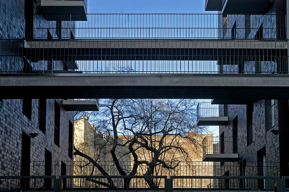 A clear and uncomplicated longitudinal zone connects all the functions (apartments, parking, public spaces). This zone and the developed structural system allows the fexibility that appears in the organization of the functions, particularly in the layout of the apartments.