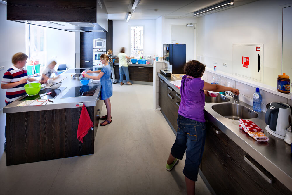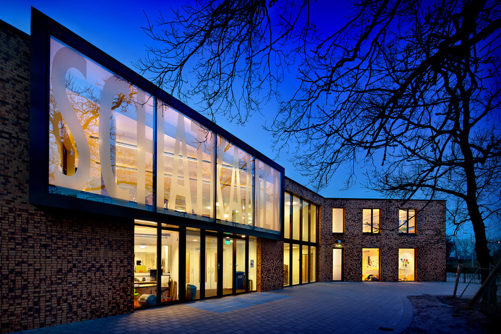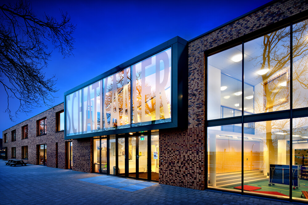 The program consists of a primary school in two layers for approx. 500 pupils. The school is set up according to the educational concept for a new way of education, called ‘Natural learning’. Also located in the building is a children’s centre with nursery, kindergarten and after school care on the ground floor.