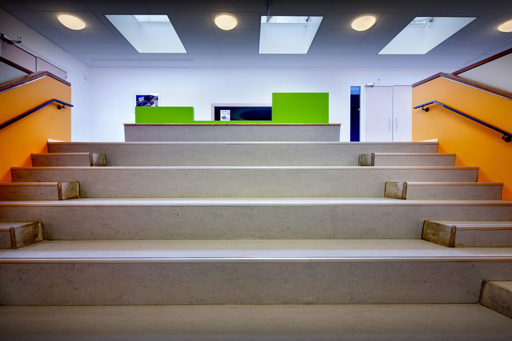 The school is divided into 5 units, surrounding a central hall. The huge stairs in the central hall can also function as a theatre. Several special functions are located around the hall, such as kitchen, playroom and meeting rooms, so that the space can be used in many different ways, forming the beating heart of the school. Roof lights and windows ensure that the hall is filled with light. Through the adjacent rooms, the surroundings can be seen, and specifically the view of the majestic oak trees brings nature into the building.