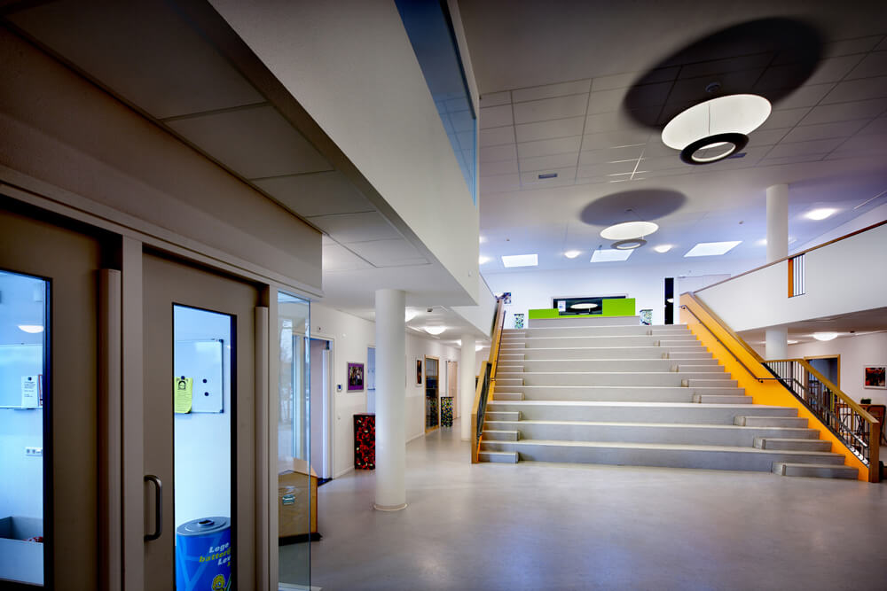 Every unit has it’s own colour scheme with bright fresh colours, which gives each space its own character and identity. Specially designed interior elements are incorporated in the building, for sitting, playing and storage. Low windows make it possible for even the smallest children to have a custom-made view through the building, a glance through their learning landscape.