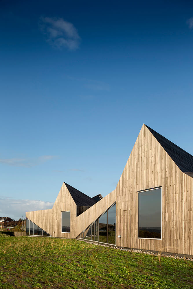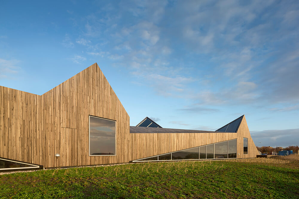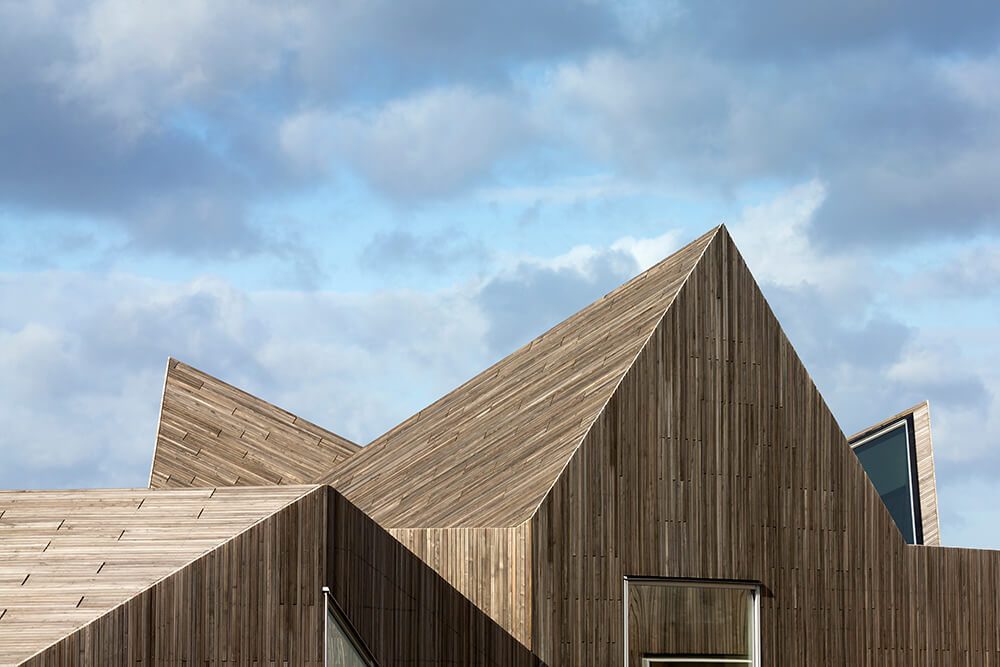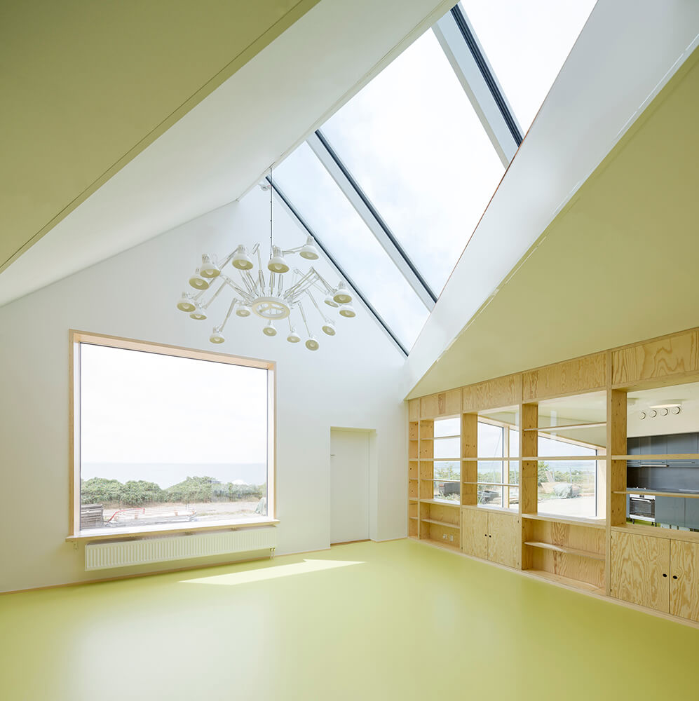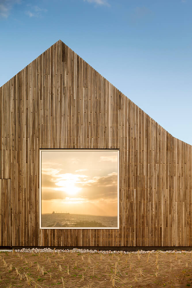The building is shaped as an interpretation of the condensed village structure, immersed in a dune. The characteristic volume of the building dominates the interior experience with interesting shapes and views of the sea and the surroundings.