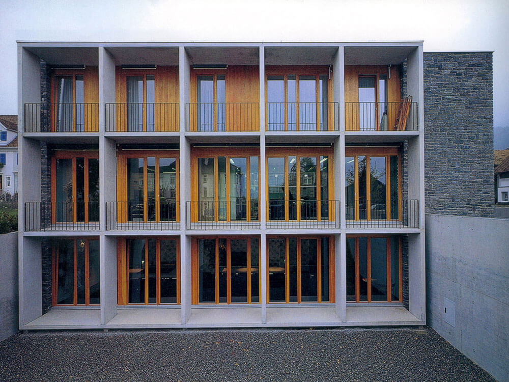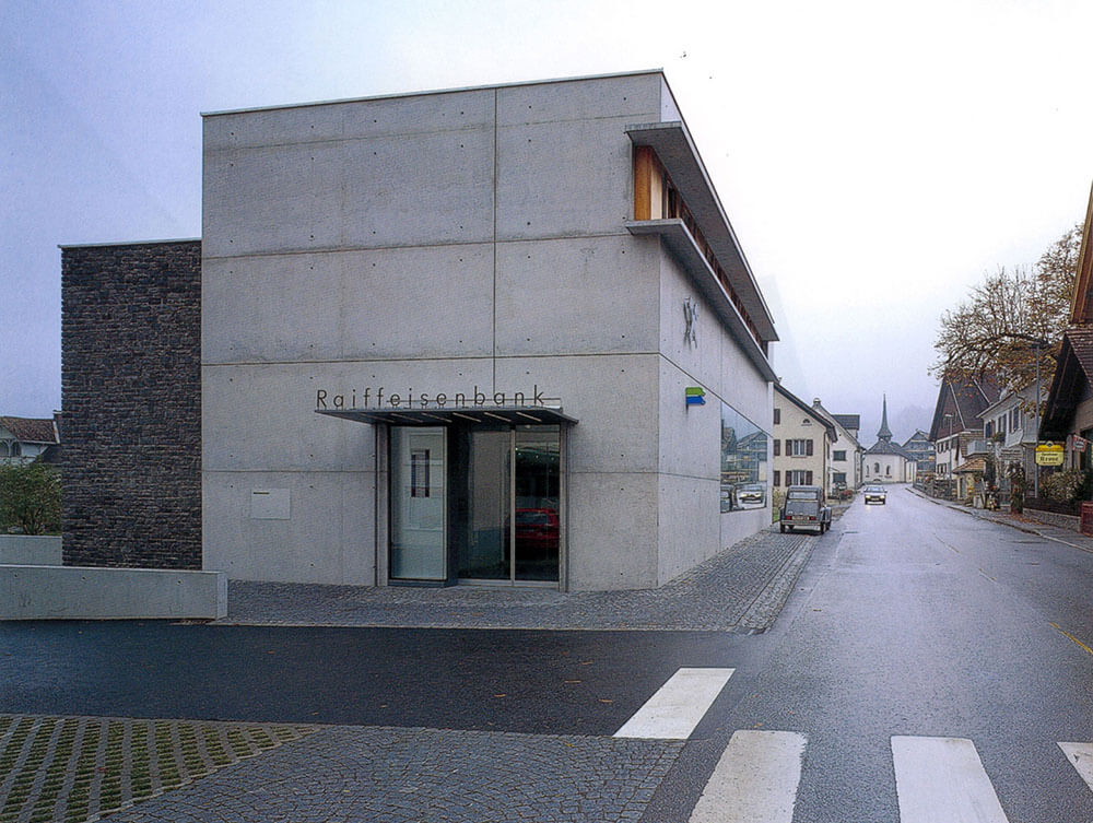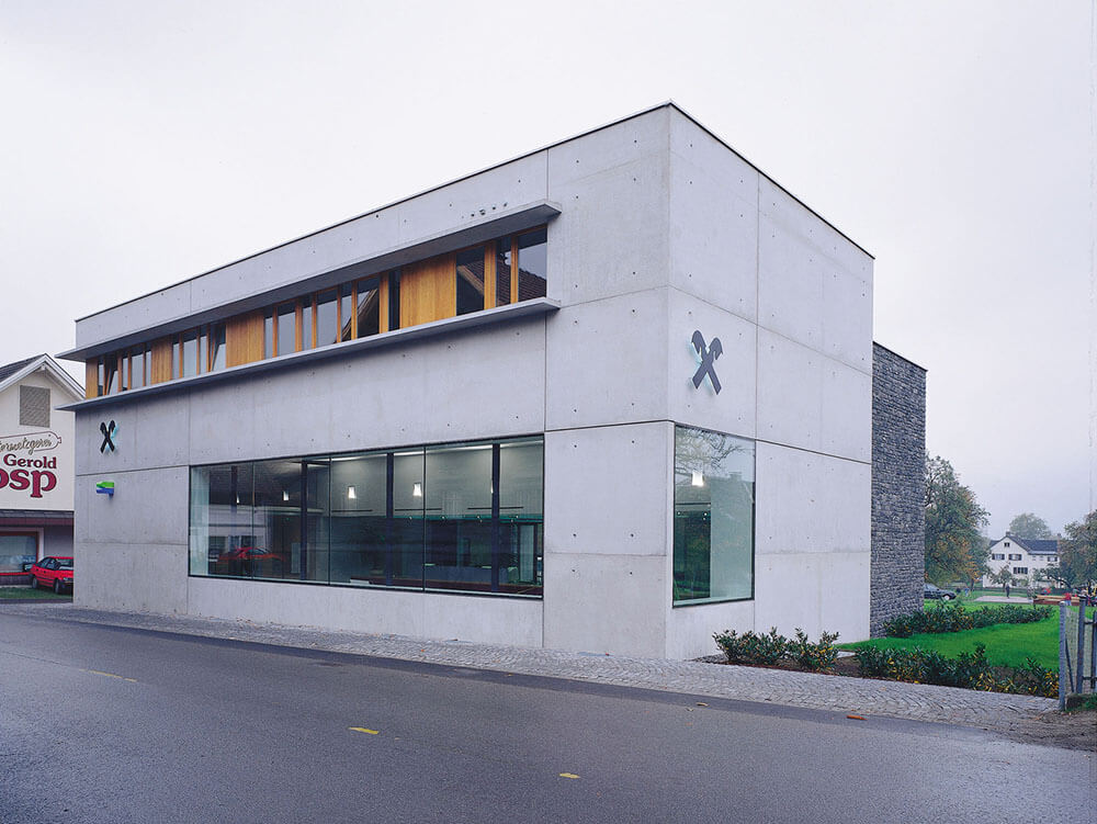 The surprisingly Janus-headed aspect of this building, which in the center of the village of Satteins and connects business and residential purposes in an urban way, is expressed in the structure: smoothness and roughness, flatness and depth, transparency and closure. To the street on the ground floor the bank hall with attached apartments, on the side the entrances to the bank and apartments, to the garden and the valley a dissolved facade. The design obviously relies on opposites: between the materials (smooth exposed concrete on the street front, on the garden-side sun protection and viewing verandas, sharp glass and gray natural stone on the central building, slender wood on the side building), between spatial layers (areas of different heights in the customer hall; differences in level between the sunken garden and the street). A work that, in its direct materiality and physicality, is more reminiscent of the architecture of the Ticino “tendenza” than of building art. Thus: a hint of a development line for Vorarlberg architecture, and probably the most mature realization by G & H.