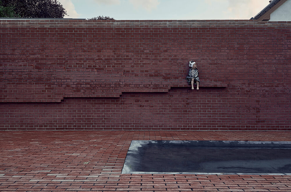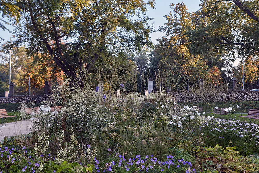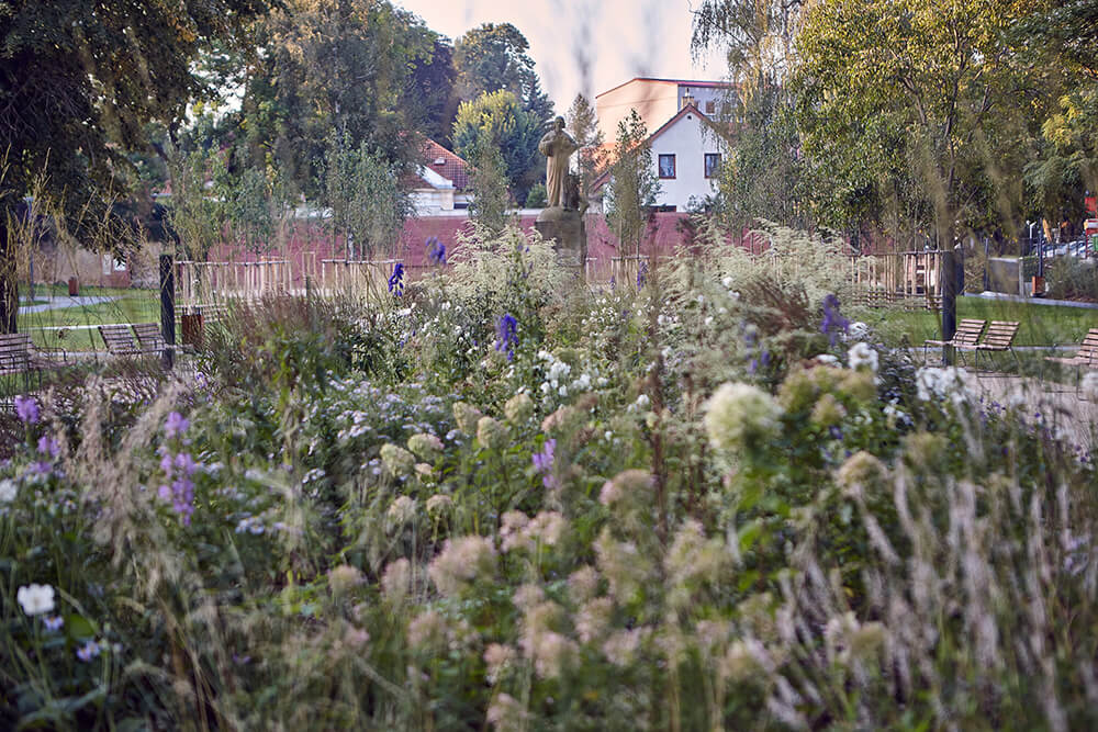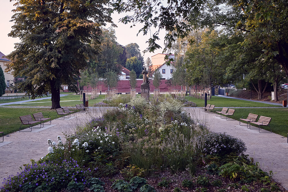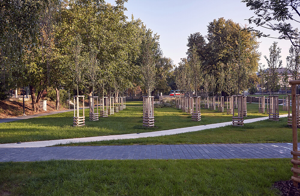 The theme of transformation is a fundamental idea of the realisation. After the conversion of the original village green, the contours of the gabled roofs remained inscribed in the perimeter walls of the park. The motif of these diagonal lines, sketches of time, is the basis for the current form of the brick wall – relief, where classic technology of the brick structure is taken to the very edge of practicability. “It’s a memento of what is no longer here, which nevertheless leaves its imprint on the place and time,” describes the author of Superpower Wall, the sculptor Matěj Hájek from S K U L L studio.