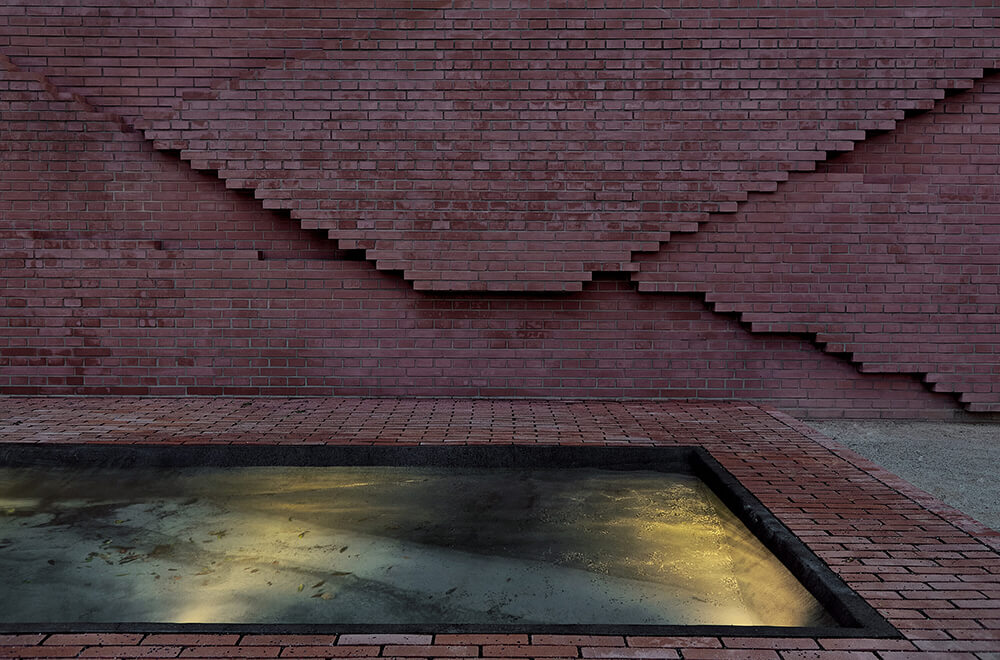 The brick relief wall is complemented in close proximity by a water feature designed by the XTOPIX studio, the dark surface of which is reminiscent in its colour of the bed of the former lake.