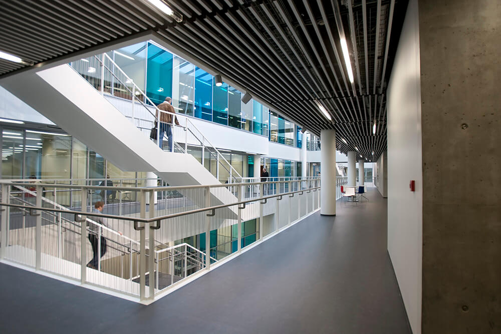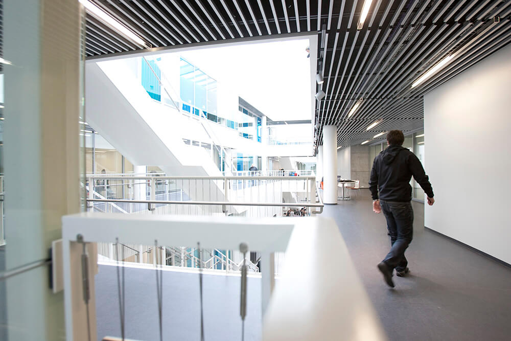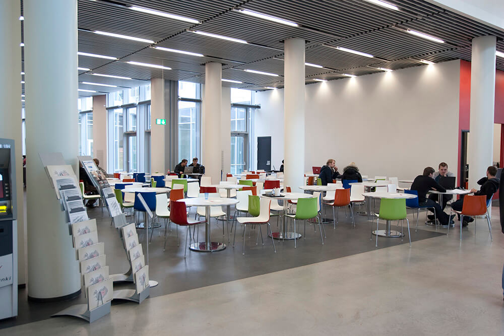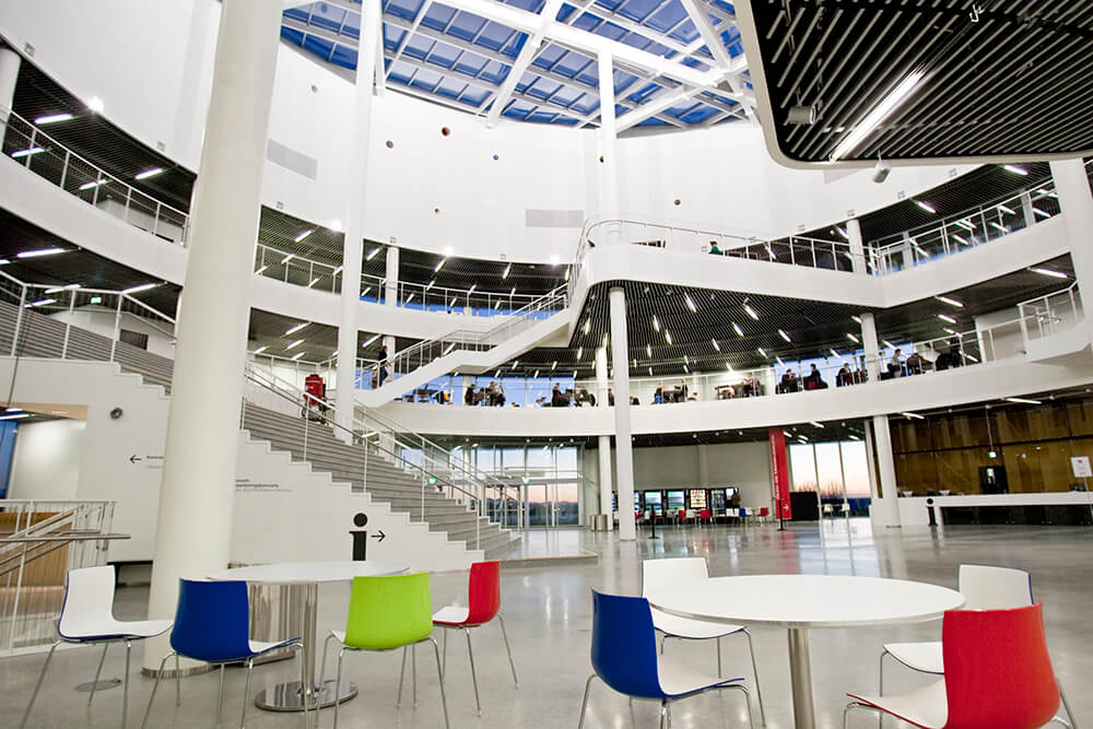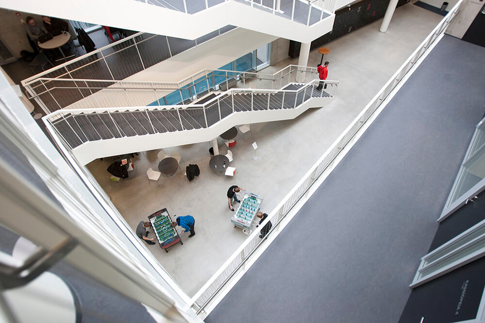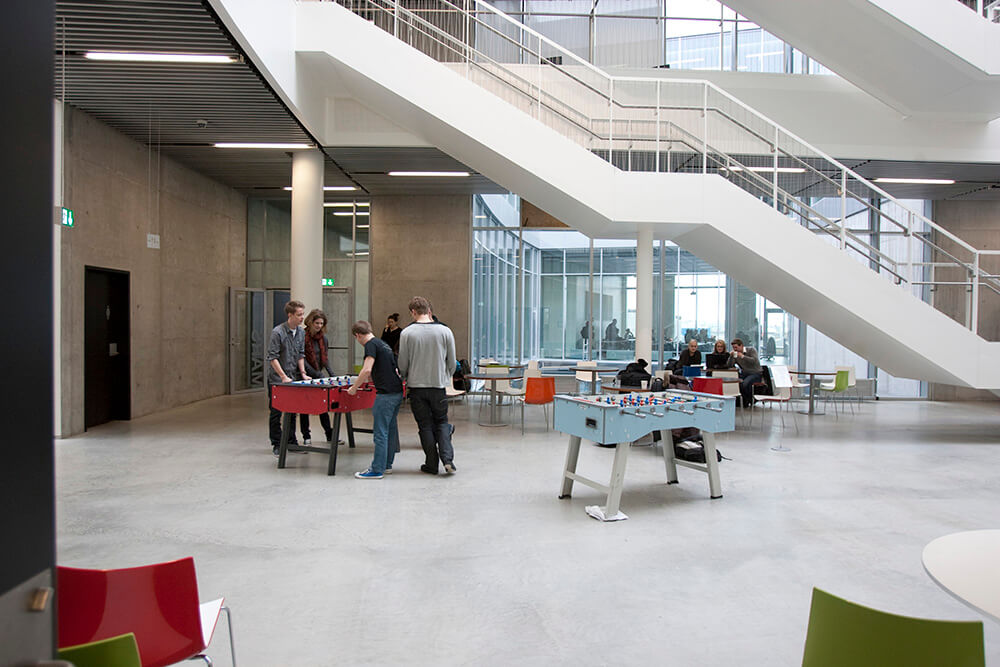 Conceptually, the building is organised around Crossroads, a vibrant central heart in the building that ties all functions together. Crossroads is a way of organising the university: to concentrate and showcase social life and activity and to accommodate a spatial social sphere embracing the whole range of functions. Crossroads is a place where people meet and a starting point for activities and events. The structure of the university, secures all institutes and faculties equal access to Crossroads. Crossroads is the public face of the university as well as its inner heart. Arriving at the main entrance, you step into Crossroads and encounter the dynamic life that characterises the University. The restaurant, cafes, bookshop, fitness centre etc. are all laid out along the sides of the space, and a sculptural staircase winds up past the first floor to the roof terrace. The broad steps of the staircase are intended to be seating plateaux, furnished with tables and seats, offering inviting places for group work or other informal study configurations. The centre of the space is large enough for major gatherings, parties and possibly a stage. The large study staircase is covered by a glazed roof that lets in plenty of daylight and offers a view of the sky. From the middle of the room there is also a view of the balcony, which is laid out as an open study area, and houses the reception areas of each of the faculties. Each reception area is flanked by a coloured wall that distinguishes each faculty, making it easy to form an overview of the location of the faculties from below.