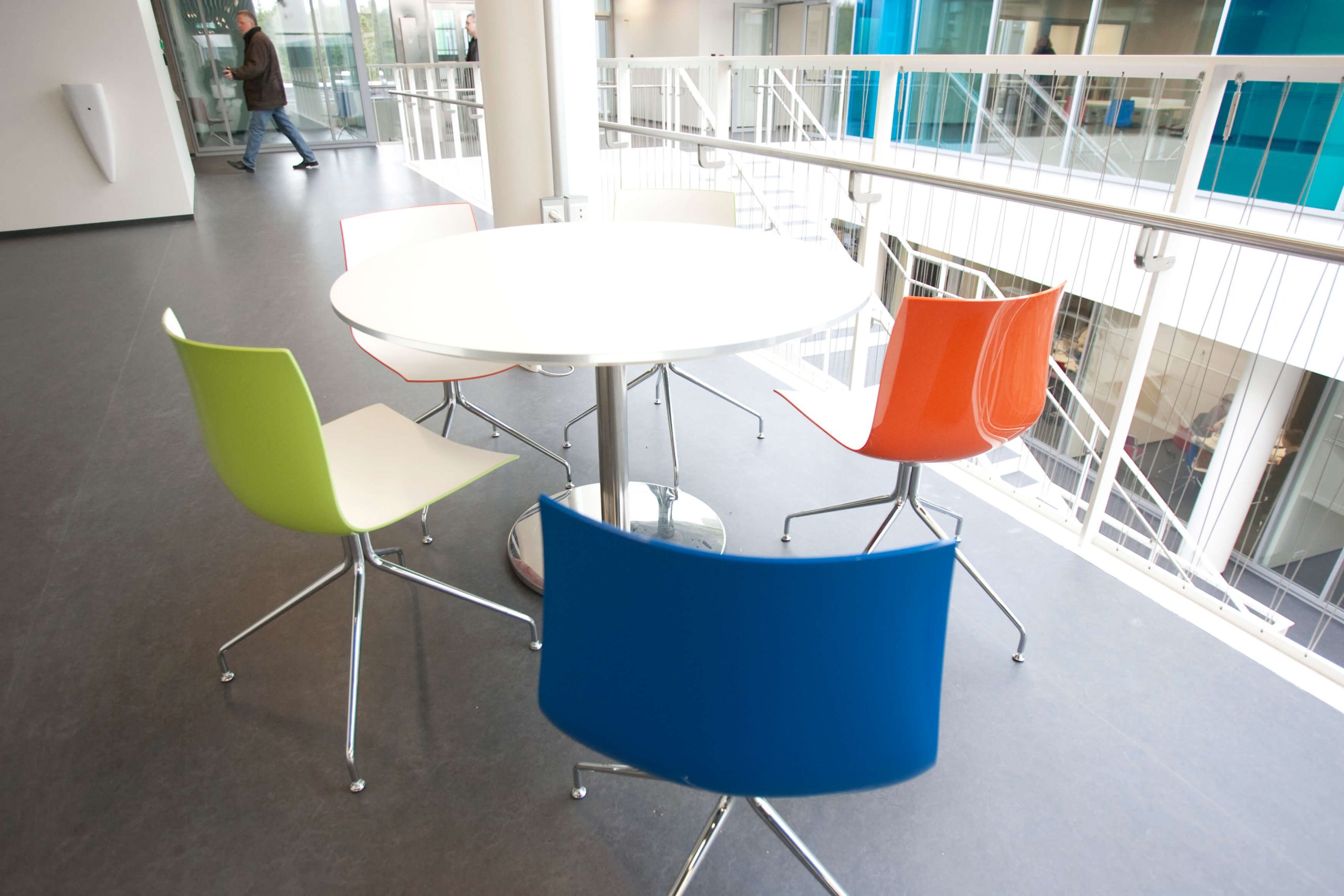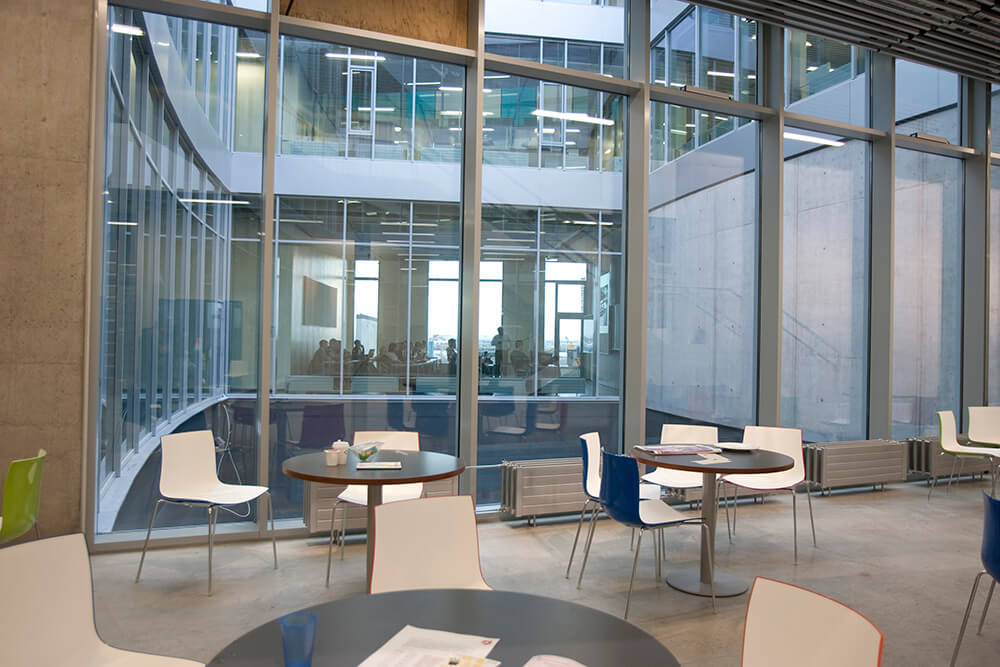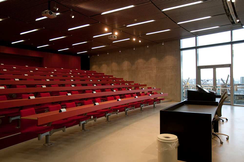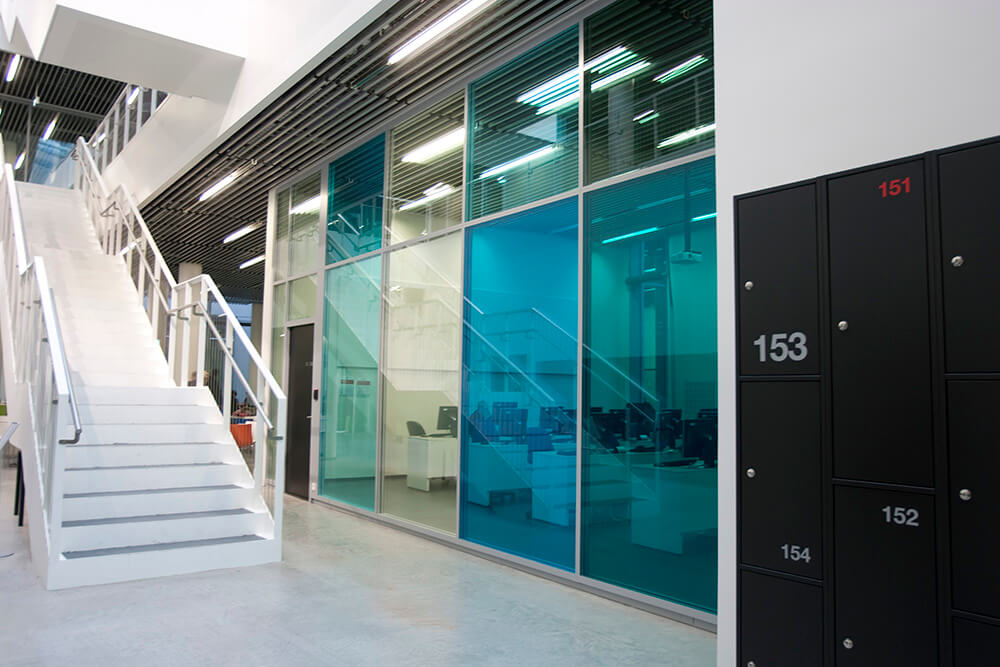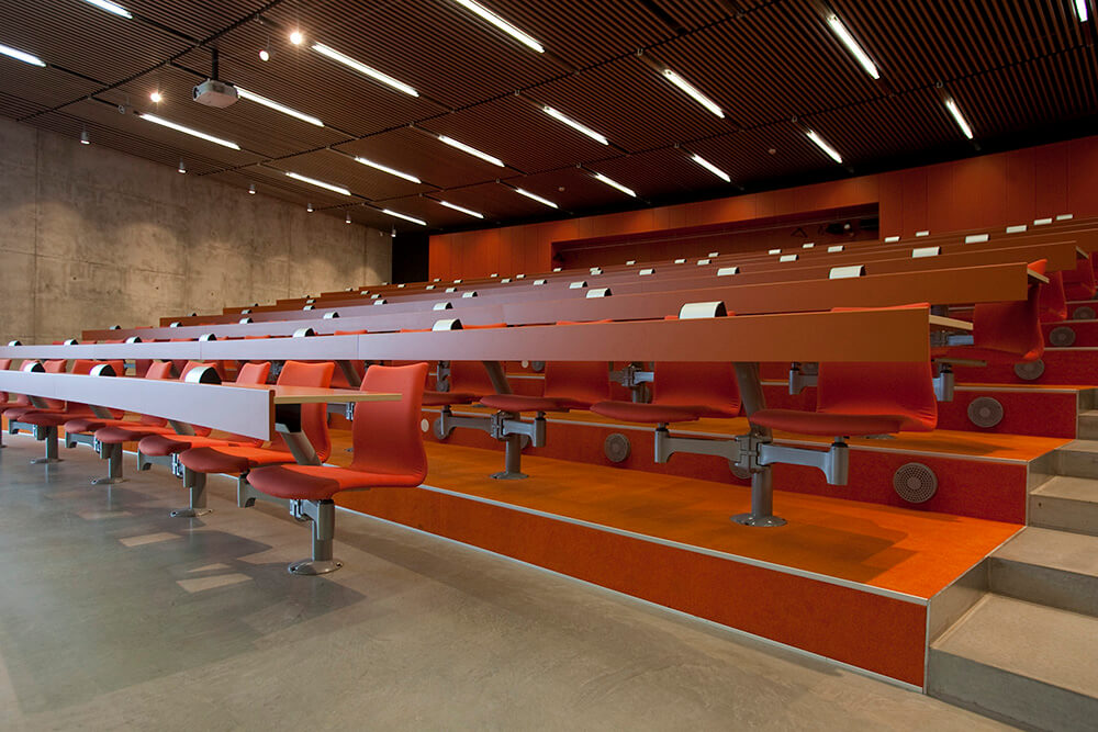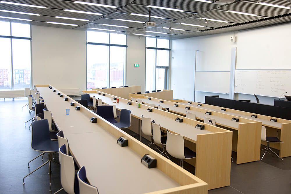 Conceptually, the building is organised around Crossroads, a vibrant central heart in the building that ties all functions together. Crossroads is a way of organising the university: to concentrate and showcase social life and activity and to accommodate a spatial social sphere embracing the whole range of functions. Crossroads is a place where people meet and a starting point for activities and events. The structure of the university, secures all institutes and faculties equal access to Crossroads. Crossroads is the public face of the university as well as its inner heart. Arriving at the main entrance, you step into Crossroads and encounter the dynamic life that characterises the University. The restaurant, cafes, bookshop, fitness centre etc. are all laid out along the sides of the space, and a sculptural staircase winds up past the first floor to the roof terrace. The broad steps of the staircase are intended to be seating plateaux, furnished with tables and seats, offering inviting places for group work or other informal study configurations. The centre of the space is large enough for major gatherings, parties and possibly a stage. The large study staircase is covered by a glazed roof that lets in plenty of daylight and offers a view of the sky. From the middle of the room there is also a view of the balcony, which is laid out as an open study area, and houses the reception areas of each of the faculties. Each reception area is flanked by a coloured wall that distinguishes each faculty, making it easy to form an overview of the location of the faculties from below.