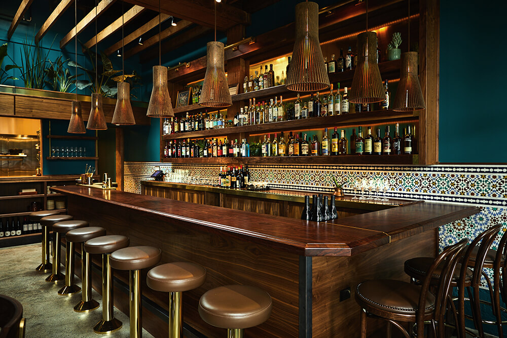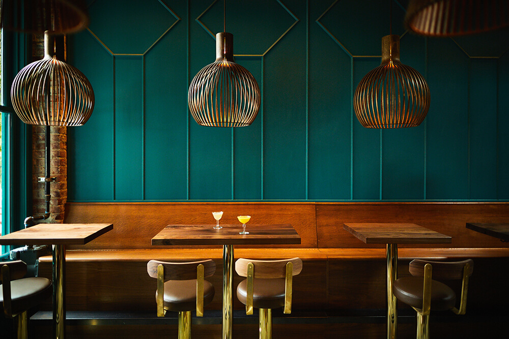 Owners Joe Sundberg, Rachel Johnson, and Patrick Thalasinos have opened their second restaurant on a small neighborhood street in Seattle. Rupee Bar, a follow up to the trio’s well-regarded restaurant Manolin-also designed in collaboration with Heliotrope Architects-was built entirely by the owners themselves. Inspired by the owners’ journeys to South Asia, Rupee Bar features a menu of Indian and Sri Lankan-inspired food and cocktails. The 700-square-foot intimate space seats 26 and brings two architectural gestures together to set the tone: color, and warm materiality. Color, a vibrant peacock green, is used to visually immerse guests within the setting and mentally transport them away from the typical gray skies of Seattle. Second, was to add a layer of warmth through the incorporation of natural material materials including wood and hand-crafted objects. Oregon walnut was chosen for its depth of color and richness. It monolithically tops the 9-seat bar and wraps the bar casework, adding a subtle nod of the Pacific Northwest into the mix. Polished brass is used for trim elements and is combined with leather for stool seating, while Indian clay tiles and slatted pendant lights add a further layer of visual interest. Together, these elements coalesce to create a holistic experience that accompanies the aromatic dishes and spiced cocktails.
