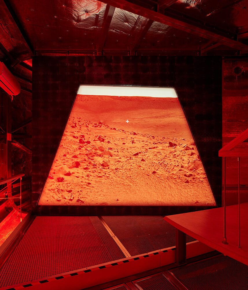 On the piazza between the buildings, the authors, in collaboration with the investor, decided to place a remarkable work of art called “Vista Mars” by sculptor Jiří Příhoda, winner of the Jindřich Chalupecký Award in 1997. It is a futuristic steel rotating spiral, with polished stainless steel surface, panoramic image of Mars on a large screen, and, with the possibility of entering the module.