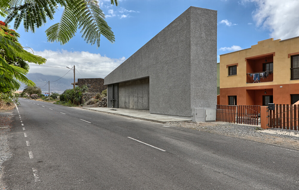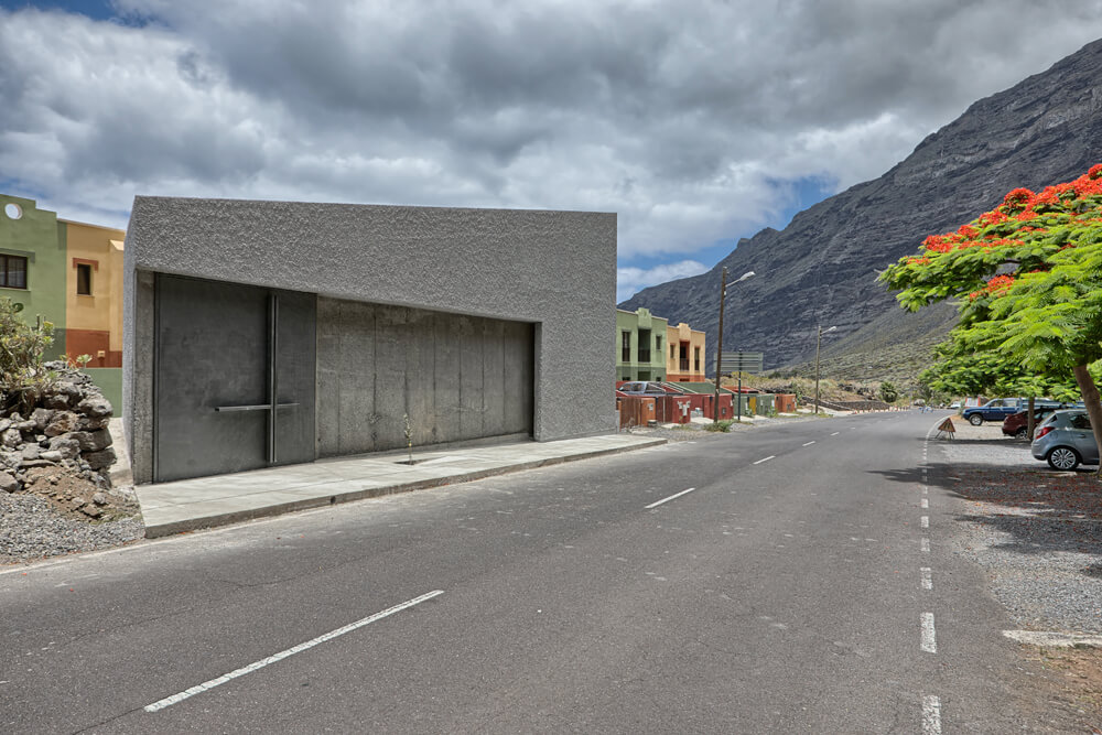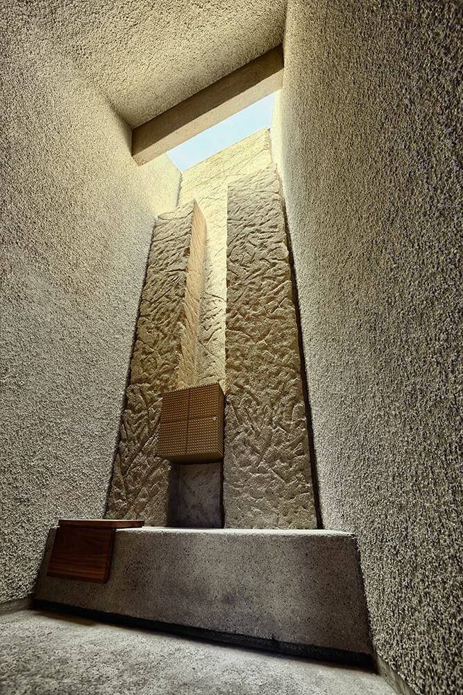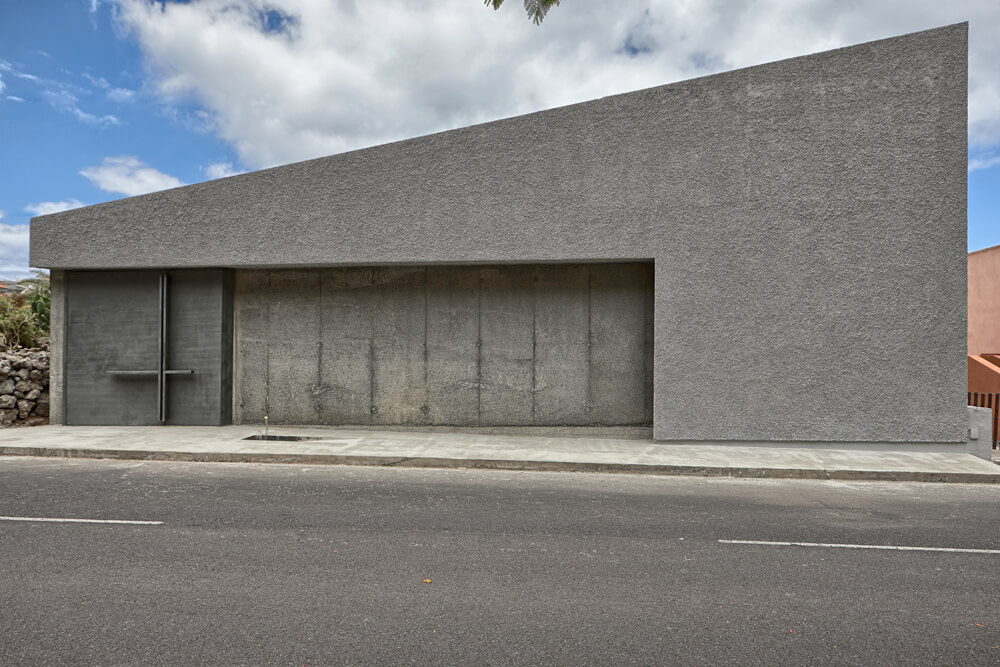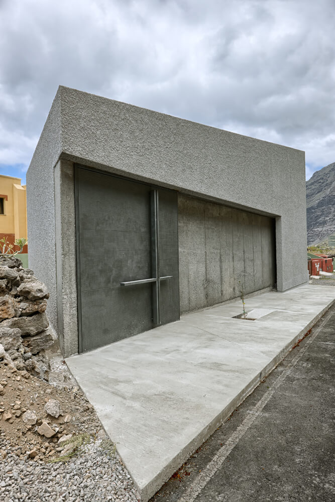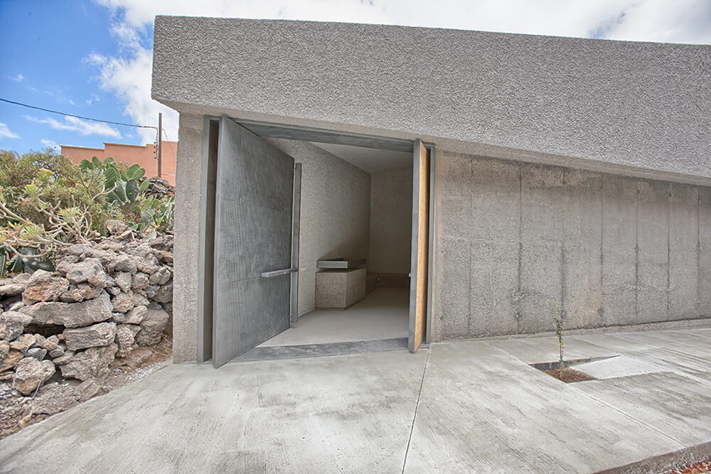 Following this above, the concrete, in contrast to the rough plaster finishes to “tiroliana” (made of crushed volcanic stones from the island), together with the interaction of light on them, constitute the material aspect of the project. And so then, it is prescribed to use smoothed concrete for the floor of the nave, aggregate concrete for the volume of the chancel, and granulated exposed concrete for the background of the altar or the altarpiece and the wall of the Epistle; the granulated concrete will be lighter on parts that form the cross. The door it is made of steel structure hidden under sheets of the same material, with large steel handles cruciforms infront, and recycled wood panels inside.