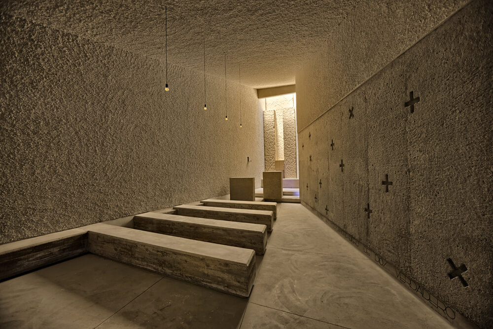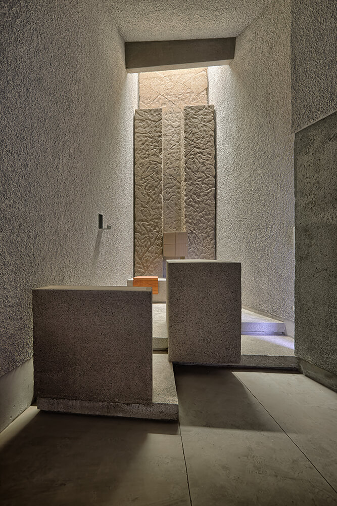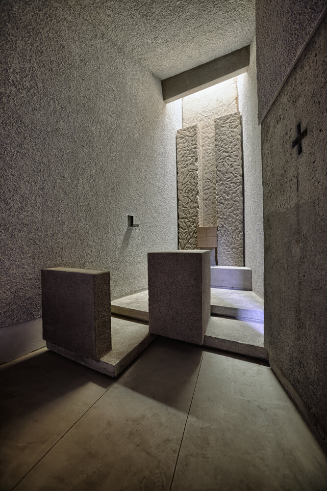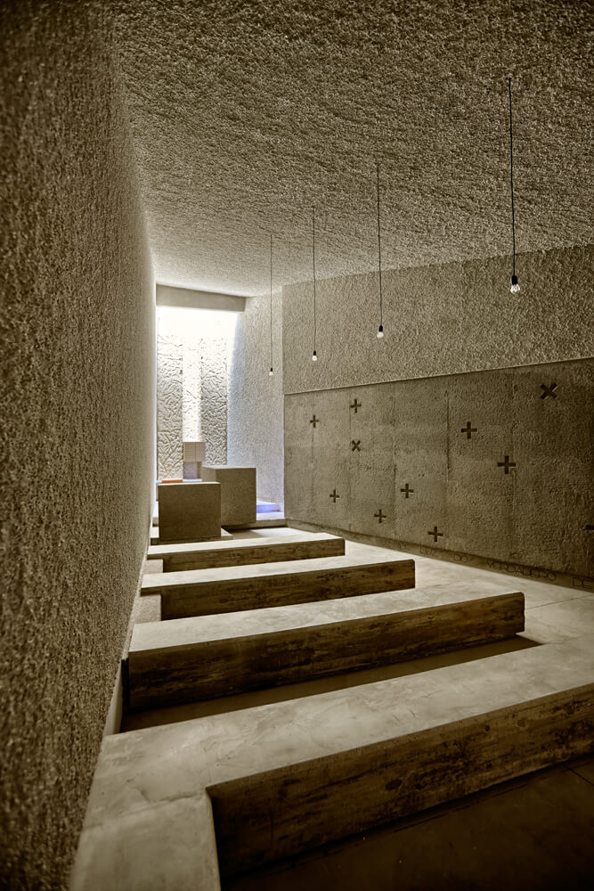 At the entrance, there is situated a baptismal font, surrounded by banks, prepared for the celebration of this sacrament. This space will also host people that will be standing during the more populous celebrations. Further, there is located the assembly, composed of four monolithic banks that emerge from the Gospel wall. The chancel rises on a two-step platform and is naturally and laterally lit by a gap being a result of the Epistle wall offset. In this mentioned wall, a Cross Via, coumpound of 14 crosses recessed in the concrete, is being designed. On the axis of the chancel, and in dominant position, the altar can be found together with an ambo, situated on its left, on a lower level. The tabernacle is available at the very end, aligned with the altar and set into a crack, that forming a cross carved in the concrete, rises looking for the vertical. At this point there is a significant overhead light input that describes the space.